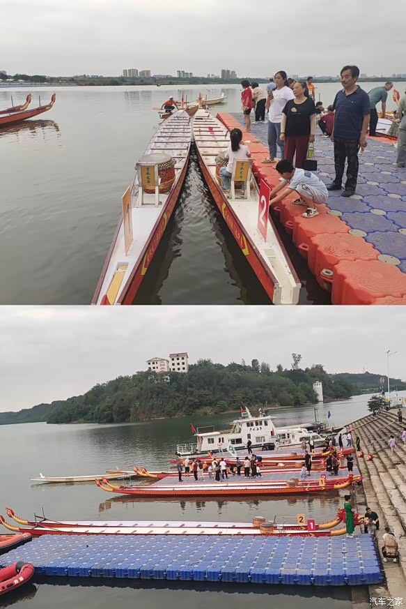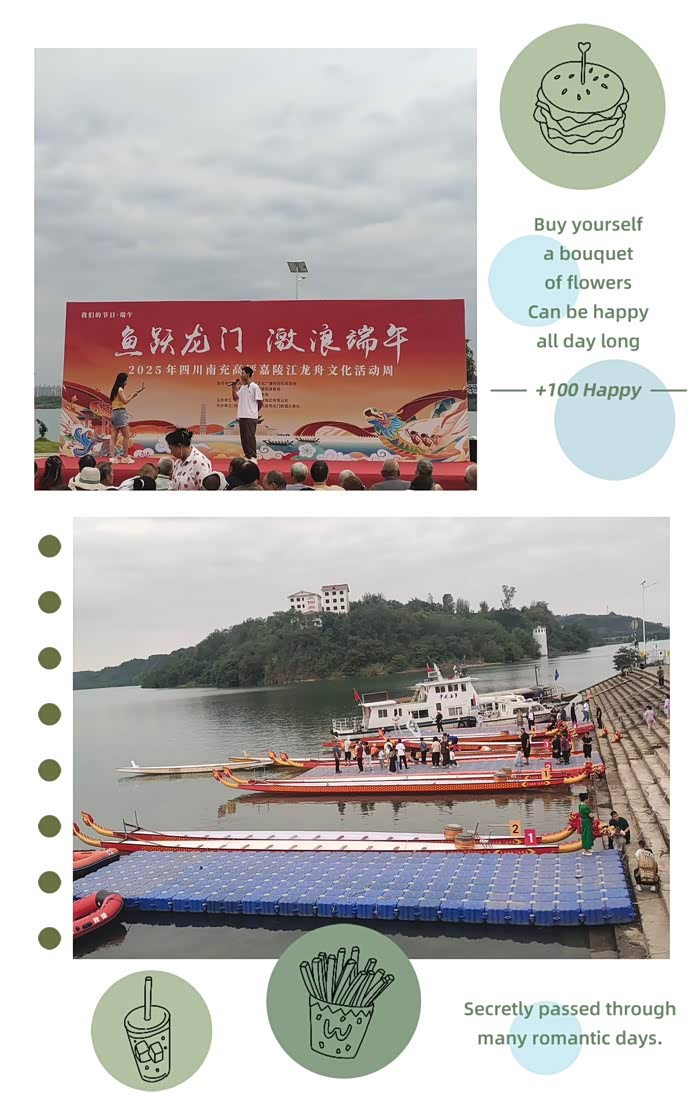 面对此情此景,我只能想象着比赛开始前,选手们在平台上做着最后的准备,他们相互鼓励,眼神坚定;随着发令枪响,选手们迅速登上龙舟,奋力划桨,龙舟如离弦之箭般飞驰而出,向着终点奋勇前进。平台周围,观众们的加油助威声此起彼伏,整个江面都沉浸在一片热烈的氛围之中。