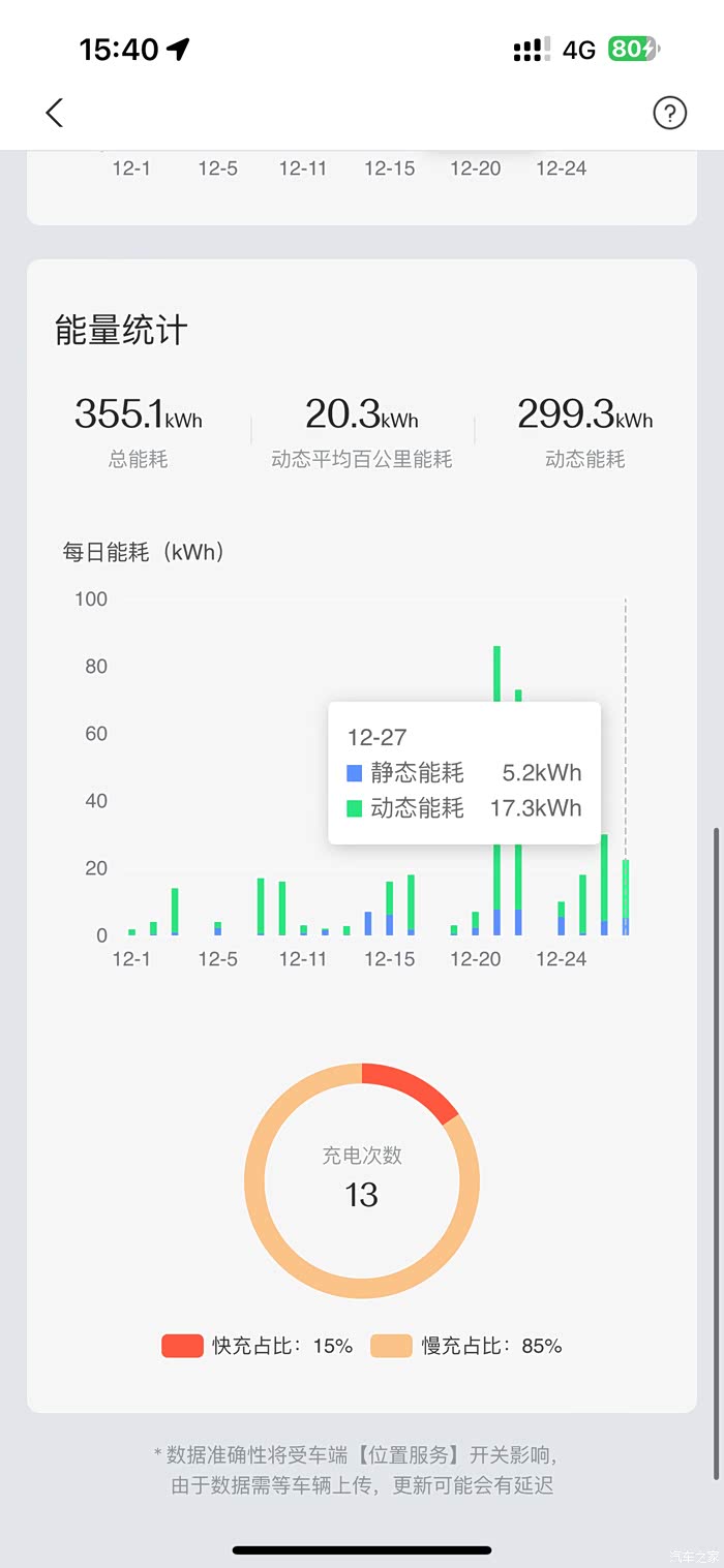 其次在续航方面,这几天我正好回了一趟家,全程高速,海拔广西,全程266公里,满电100度回去,全程平均120km/h,到达目的地时电量剩余42度,夏天5月份的时候剩余47度,冬天实际减少5度电,折算下来相当于少35km这样,其实影响一般,有可能是南方的温度没有到达极寒的情况所以对电池的影响我个人认为不算很大。当然这也可能与我的驾驶习惯有一定关联,冬日开车其实和开油车还是有一定相似之处的,就是刚开车时应该低速长时开十分钟,让电池热起来再提速,或者也可以在app里面设置预约出行,这样可以在开车前提前预热,让电池达到最适合出行的温度,这样对电池的损耗可以降到最低。还有更简单的办法,就是开慢车,高速全程保持在105时速左右,不突然加速,不仅仅可以降低能耗,还能降低对电池本身的损耗,以上就是我在冬日的续航测试以及自己总结的一些经验办法,大家可以按照我的方法去试试,会让这个冬季对续航有一定的帮助。