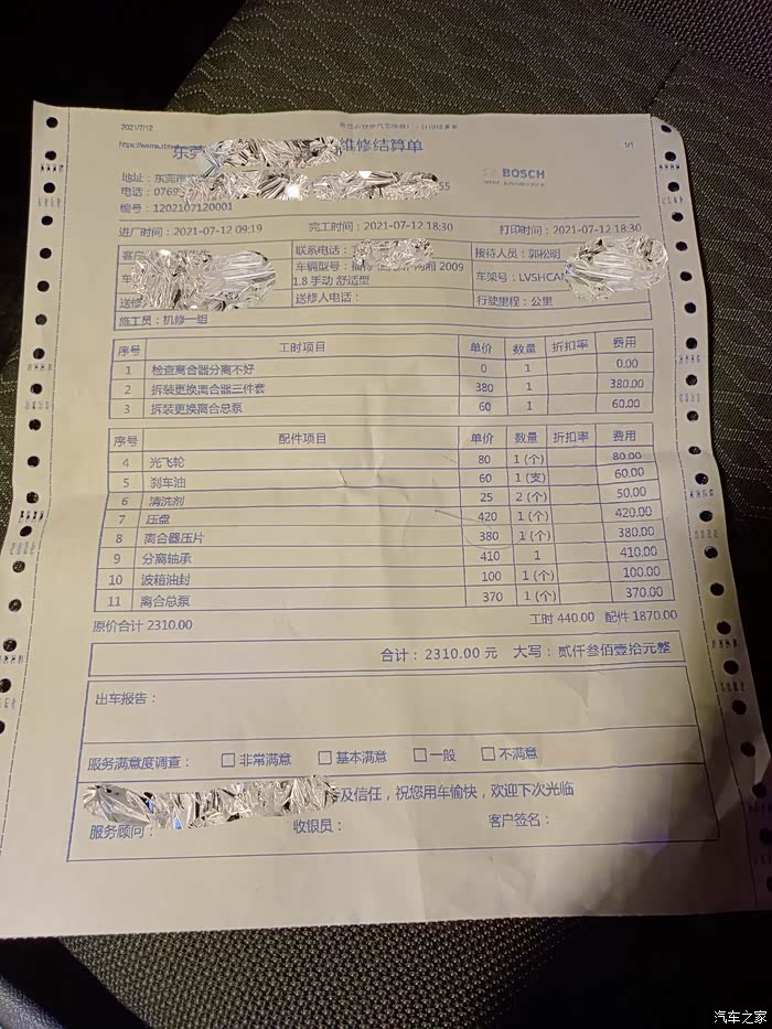 09经典福克斯去年淘的二手货,接手到现在刚好一年,10万公里跑到了12万,原表应该有调过的吧。接到手开了半年怠速就感觉有吱吱响,踩下离合声音消失。问过离合更换大工程大概两三千,所以一直没处理,就被扔路上了。出故障后,离合没有了,踏板很轻,完全没有阻力。当时时速大概50左右,正在四挡位置,马上双闪靠边停车,刚好有个小路口就开进去了。零晨12点多了,搞的一脸懵逼也没叫过拖车,就在附近住了一晚。第二天6点多就起来了问了下修车的,都是只能打保险电话叫拖车。打了电话拖车很快就来,但距离经常修车的店有70公里,保险免费只能拖50公里。后面就在拖车老哥介绍的店就直接去修了。目前开了快300公里,除了感觉 离合高了很多,暂时没啥问题