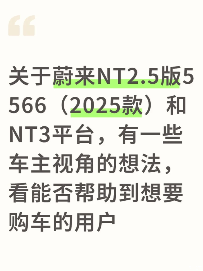 “纠结了三个月,最终提了NT2.5的ES6,现在觉得没选错。”2025年,随着蔚来NT3平台车型逐步上市,25款5566(基于NT2.5平台打造的ES5、ES6车型)成了车友圈的“争议焦点”——有人说它“能耗高、智驾不成熟,不如等NT3”,也有车主晒出4800公里实测数据,直言“换电便利度和使用成本,NT2.5比NT3更接地气”。到底该选现款NT2.5,还是等未来的NT3?从真实车主的使用体验里,或许能找到更客观的答案。