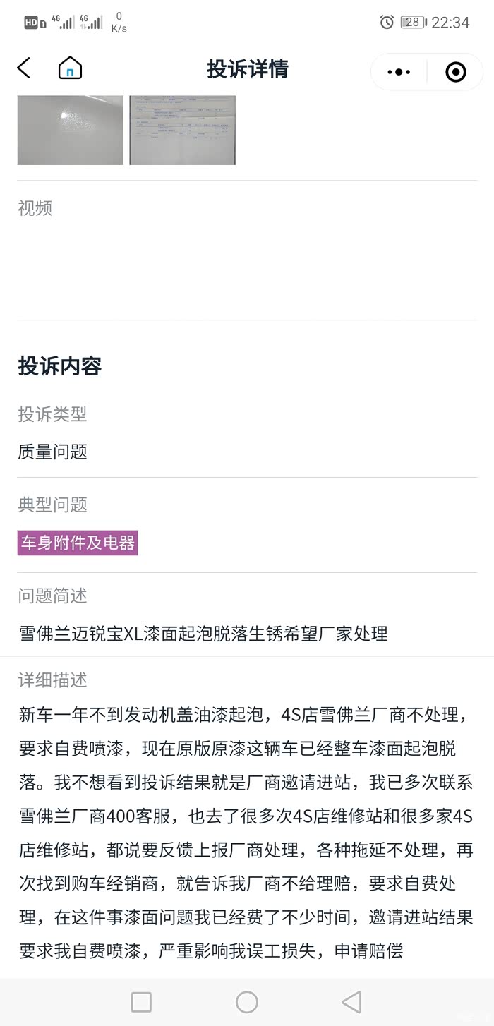雪佛兰迈锐宝XL漆面起泡脱落整车生锈,厂家与4S店不处理