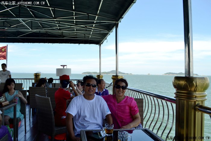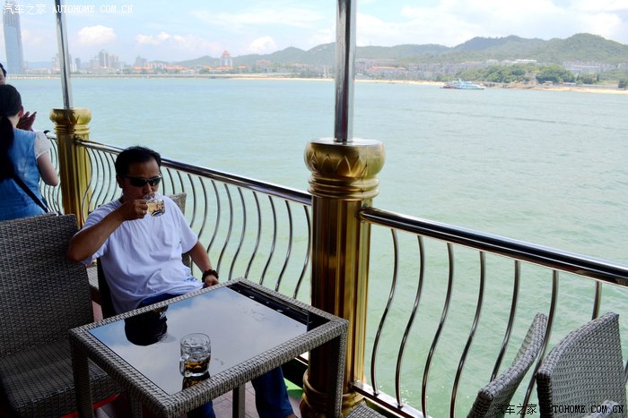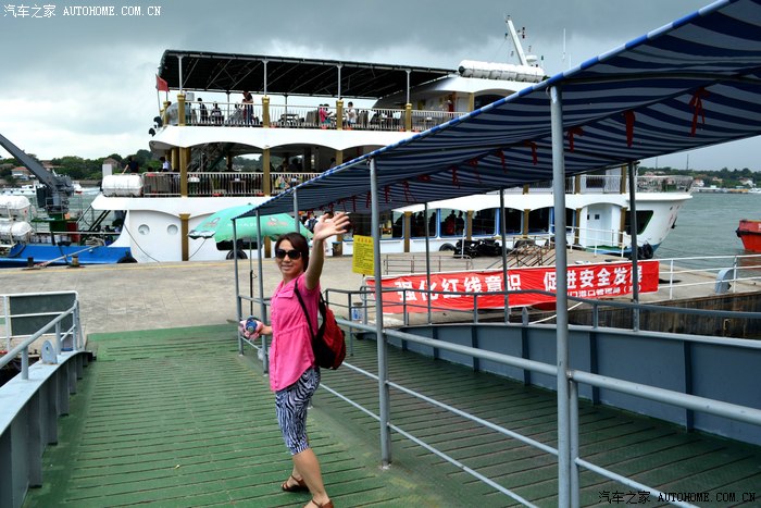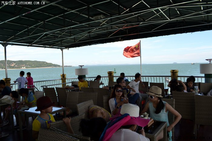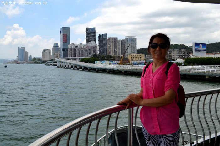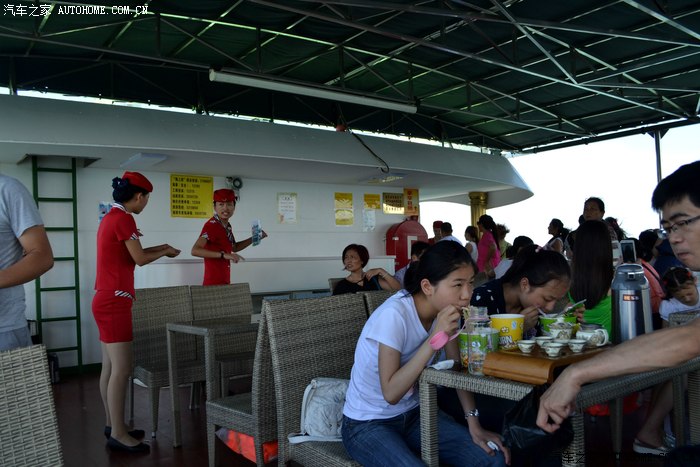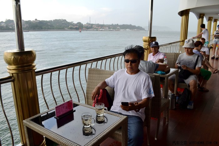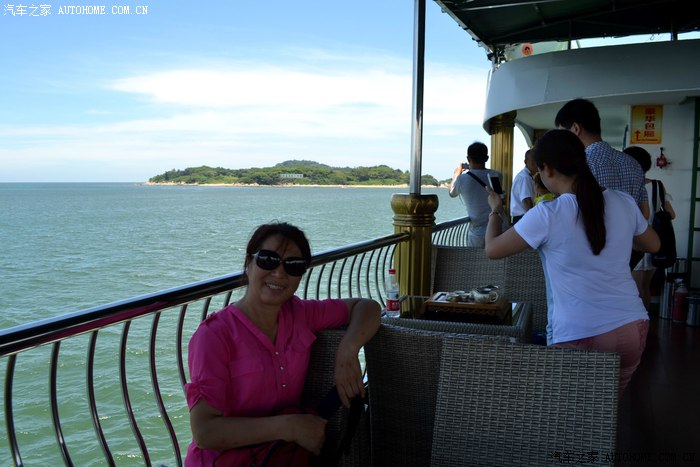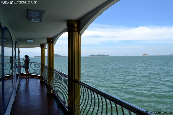 服务小姐刚忽悠完租望远镜给乘客,又在忽悠乘客付费去船头拍摄金门岛。