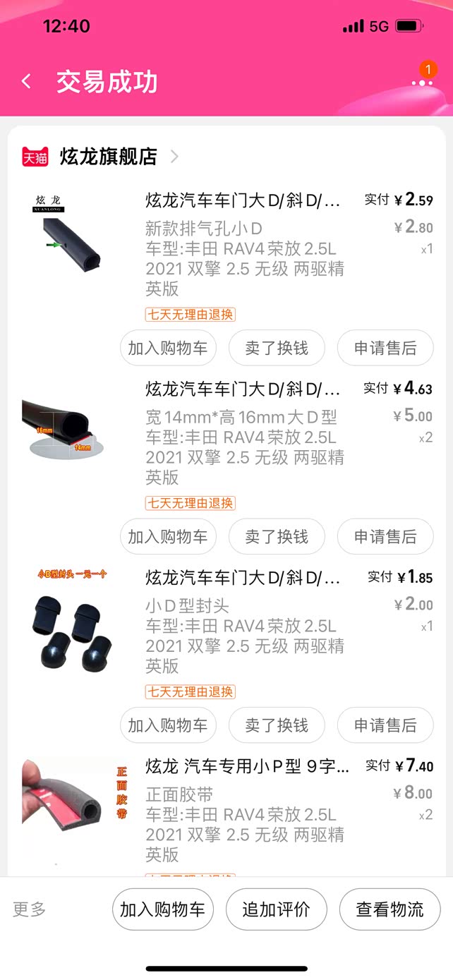 对比发现皇冠陆放的密封条在B柱和后尾箱门盖板处有加强密封条 遂在网上也买了大小不同的几款密封条,这家店之前就买过一次,他家质量确实无可挑剔
