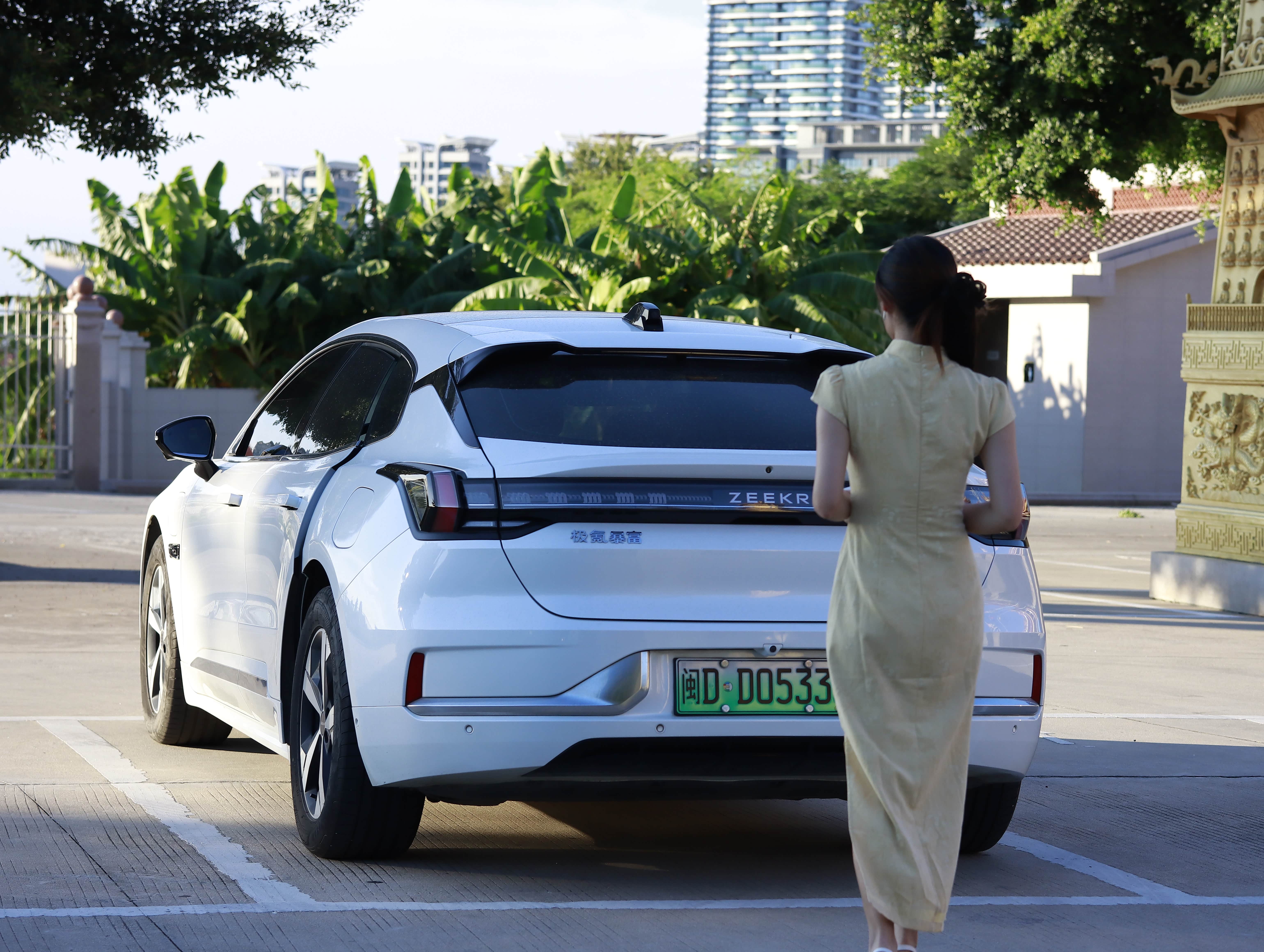 3、站在车尾,打开示廓灯,让贯穿式尾灯亮起来,科技感直接拉满。机位稍微低一点拍,抬头看向远方,仿佛是两个时空在默契地对话。