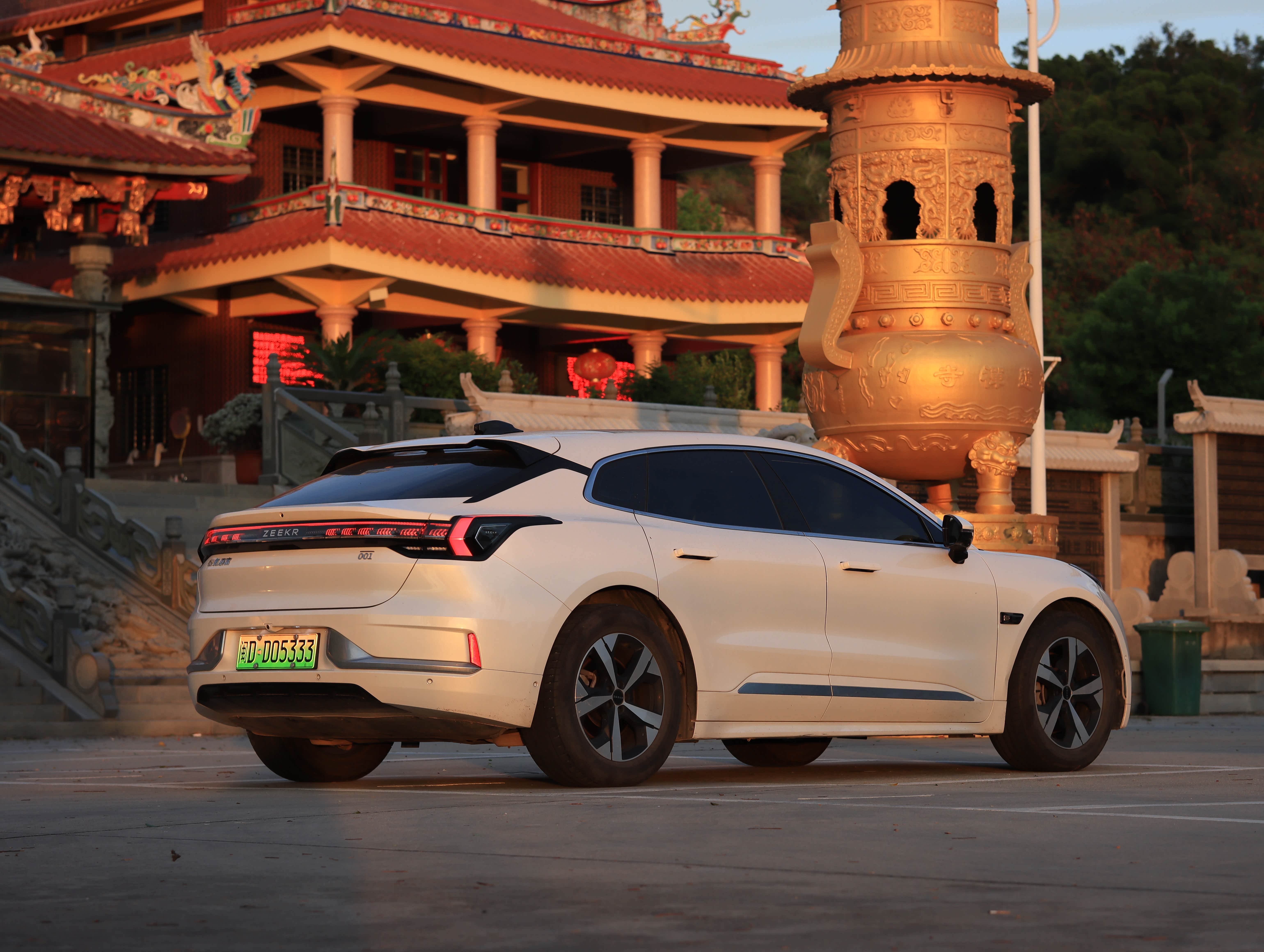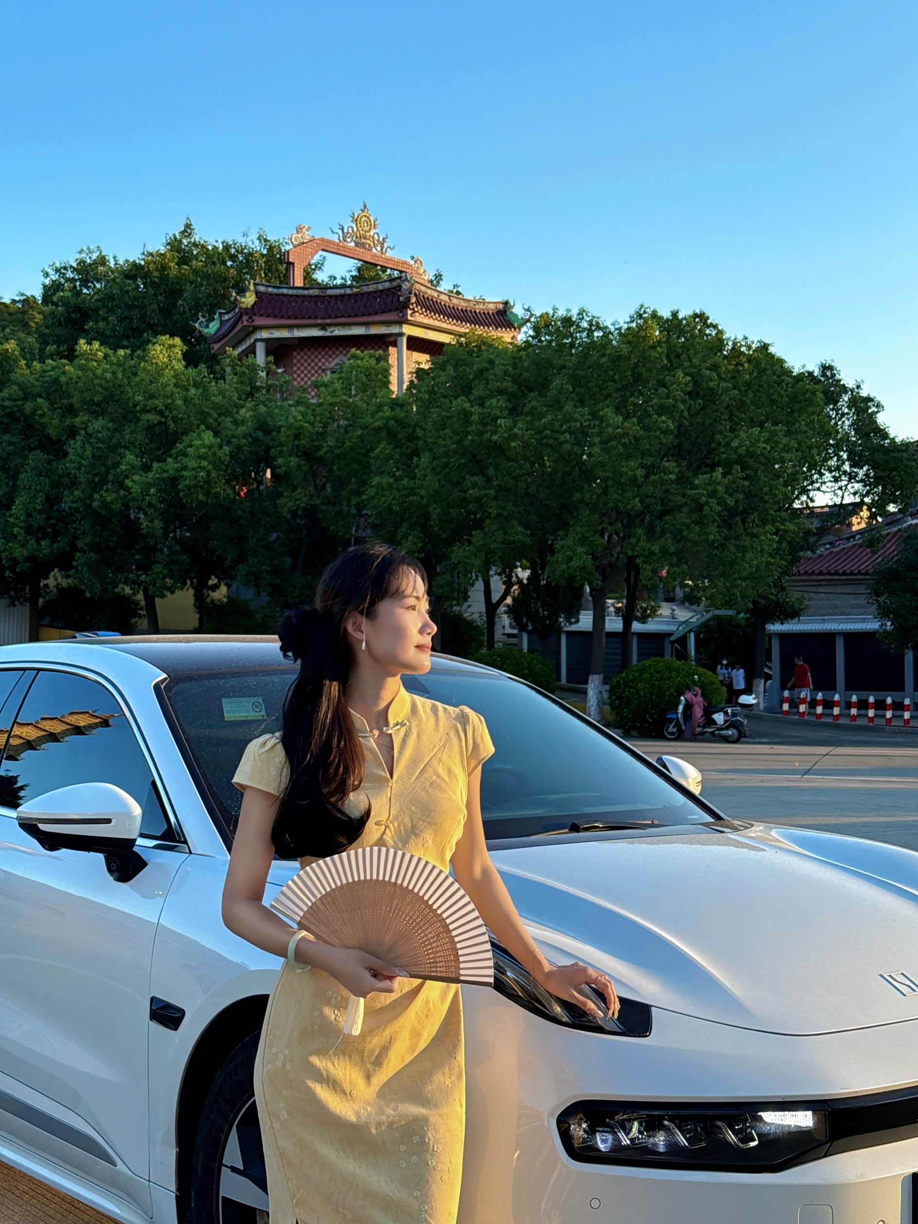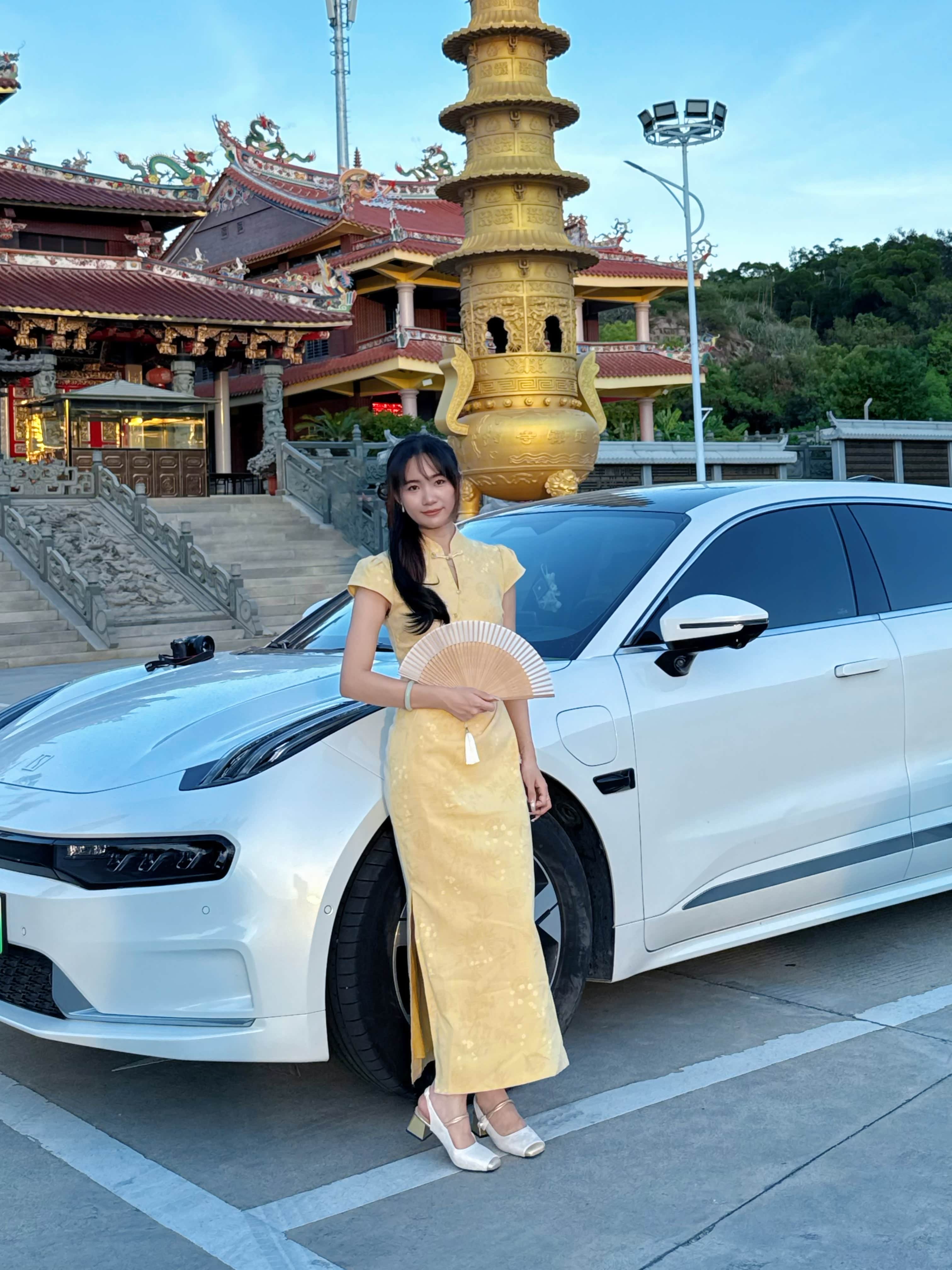 1、我最喜欢的一个机位是车的侧前方45度角。这样既能拍到001经典的猎装溜背线条,又能把后面主殿层层叠叠的飞檐和右边那座金色宝塔一起收进画面。