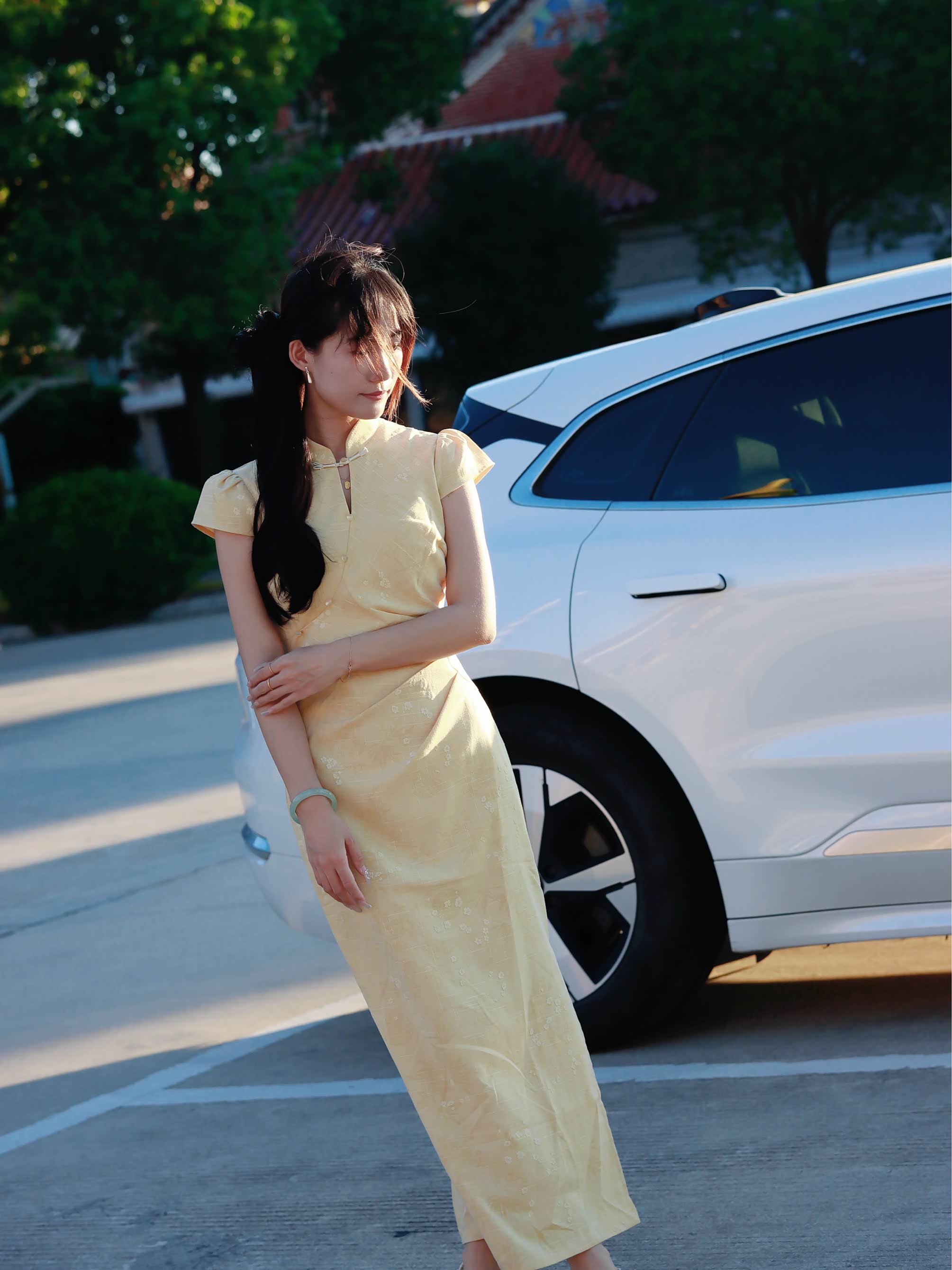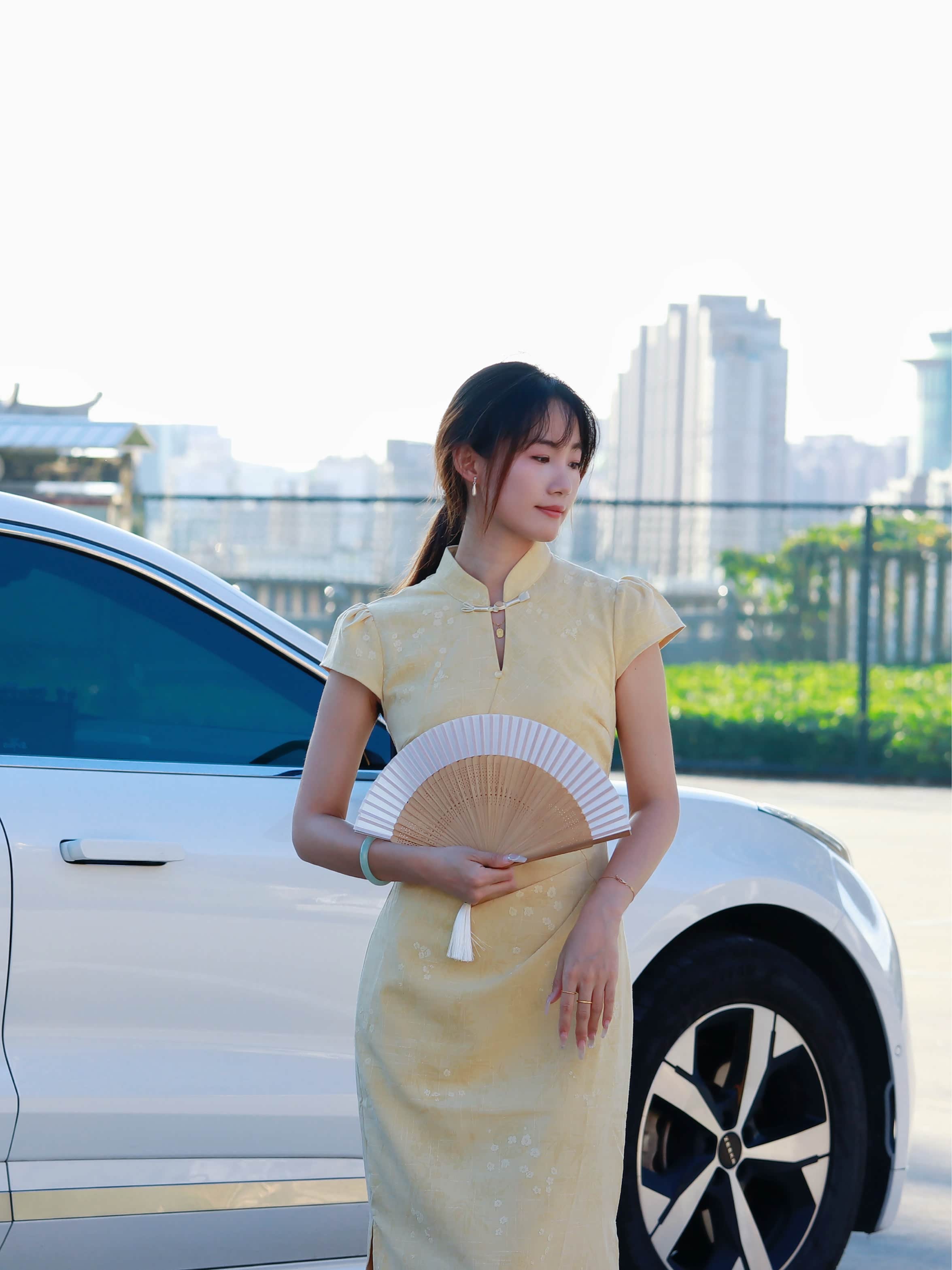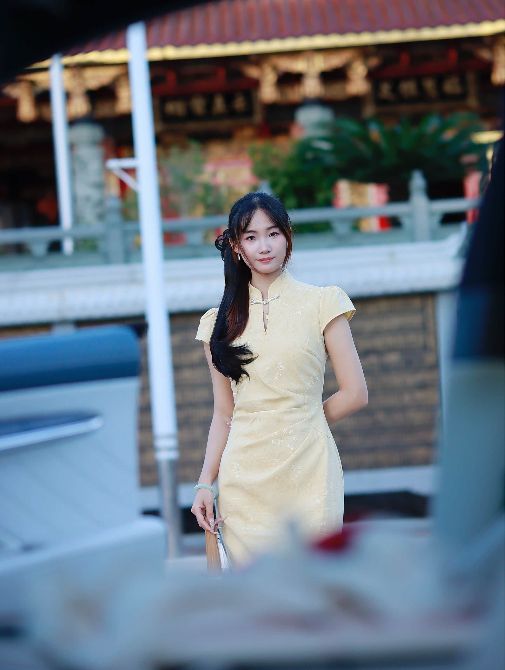 今天穿了一件鹅黄色的旗袍,第一次尝试这种古典风格,整个人都显得很温柔。