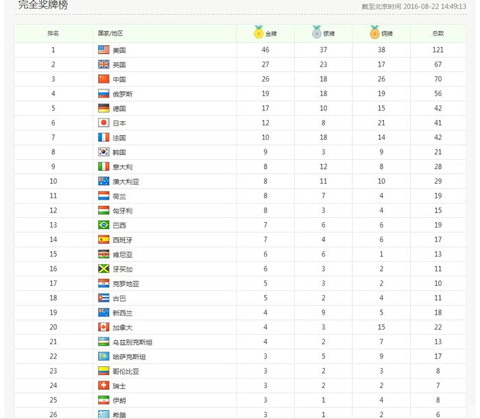 北京时间2016年8月22日,2016里约奥运会落下帷幕,中国国家队以26金、18银、26铜 奖牌总数70的不俗成绩位列奖牌榜第三,