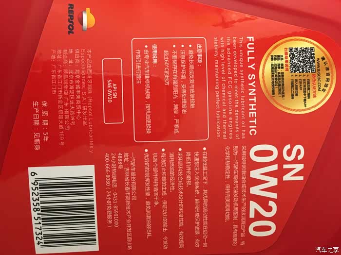 订车时告诉我送5年10桶机油,SN级原厂全合成,我特意看了下瓶子是这个(368)