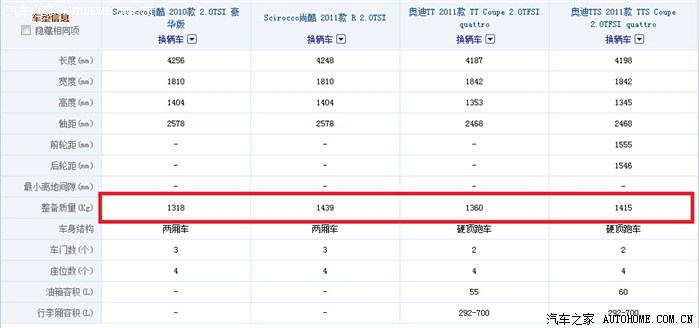 为什么四驱TT和TTS质量上差了55kg 2.0t尚酷却和尚酷R差了121??