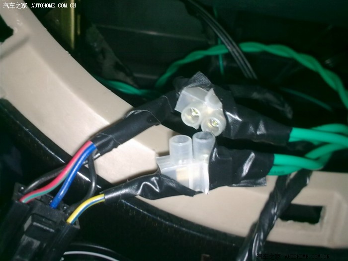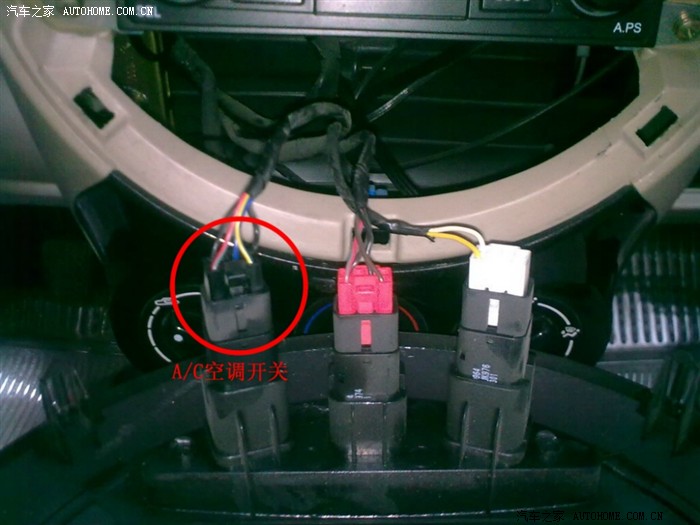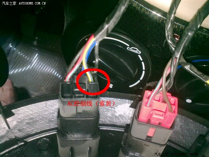 3、经过用万用表测试,右下角这一根黄蓝色的线,是AC控制线,也就是说,当空调开关打开的时候,这条线接通12V电,我们要把这条线剪断,以加入温控开关:
