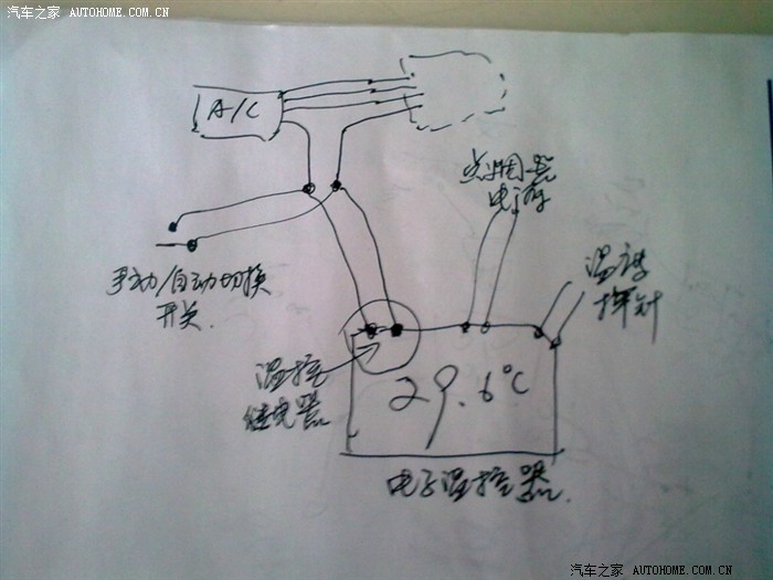 熊猫和大部分手动空调轿车一样,是用AC开关串接风扇开关来共同完成控制空调的运行。只有在打开风扇开关的情况下,同时再打开空调开关,空调才会运行。如果在控制空调运行的两个开关上再串上一个温度控制开关,那么,在AC开关、风扇开关、温度控制开关三个开关都打开的情况下,空调才会运行。温度控制开关在这里的作用,就是根据车内温度,决定开关的闭合:当温度高于某一设定值时开关合上,反之开关关闭。另外,在冬季、雨季除雾时需要强制空调启动,因此,需要另外加装一个“手动/自动”切换开关。