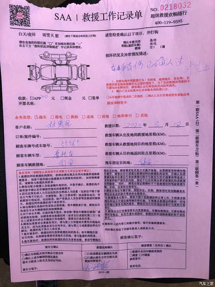 在交车时,我和板车师傅对我的车子的车身损伤部位进行了确认,双方都照相了。