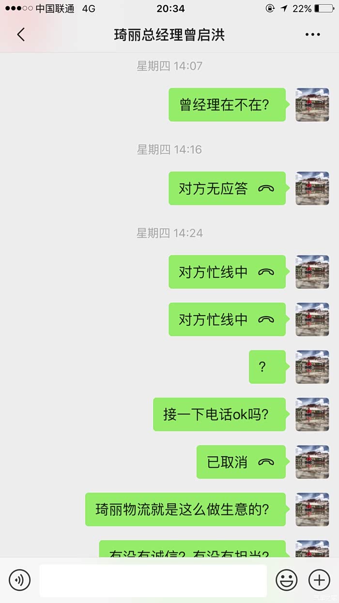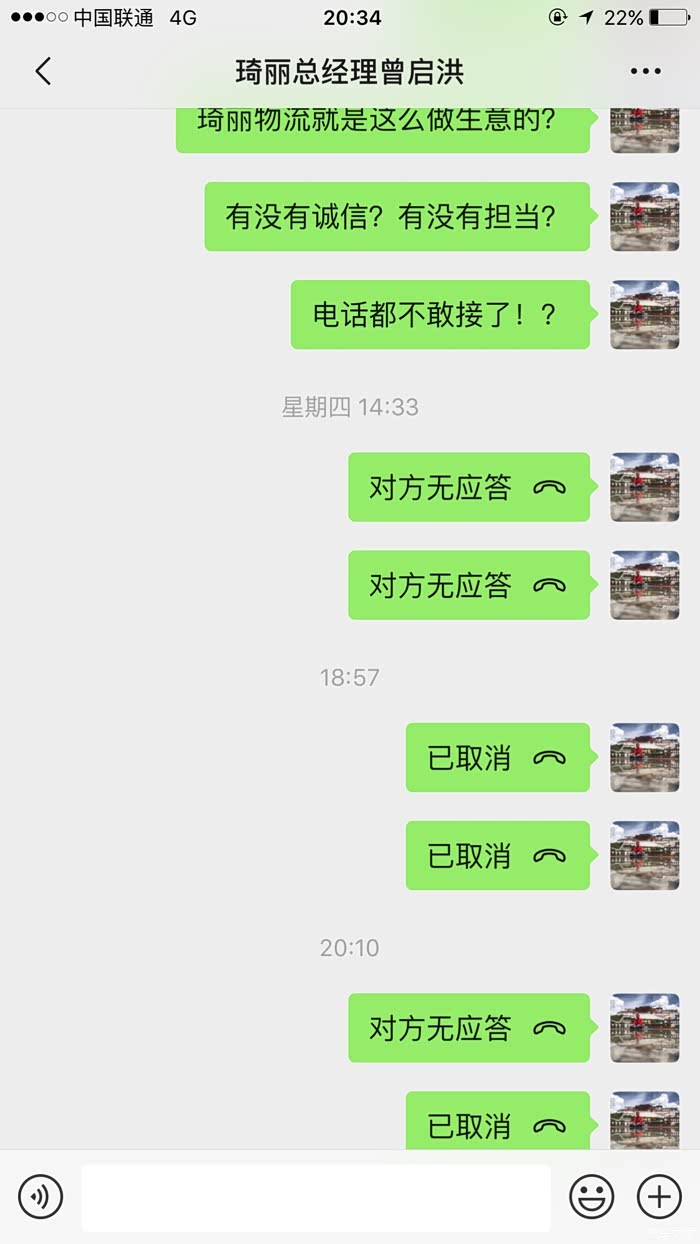有意思的是,当你拨通琦丽的电话,电话那头会传来“欢迎致电琦丽物流,我们坚信诚信、安全、快捷的企业精神,让您满意”,琦丽的宣传口号与做法背道而驰 。讽刺呀~~~~