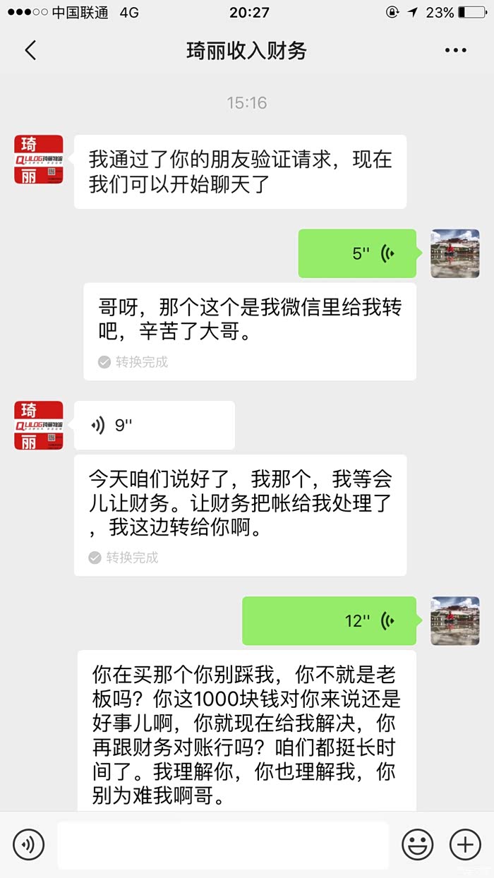 2020年4月11日下午3点,我再次拨打财务电话,仍无人接听电话,当我用朋友的手机拨打财务电话,财务人员接电话了,我问何时打款?财务人员又以各种理由推脱,我实在不能再这样跟垃圾公司周旋下去,我问财务人员 ,你们想赔付多少钱?财务人员想了一会说赔付1000元。我再次让步,我说行,你赶紧赔付吧。财务人员让我加他vx好友,我加了以后,本以为对方会立即转款,没想到又是推拖!