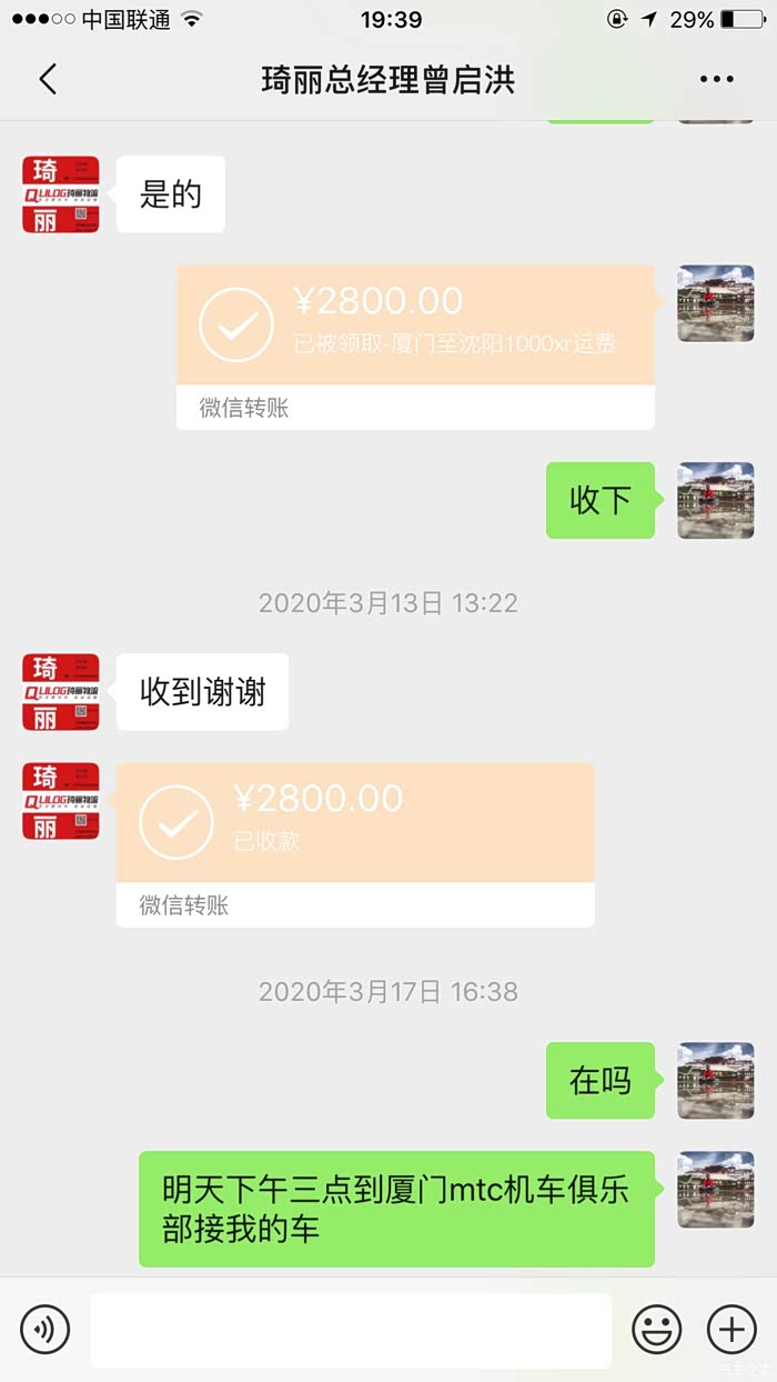 我找琦丽物流是和贵公司一名叫曾启洪的经理vx谈的,运费2800元也是转账过去的