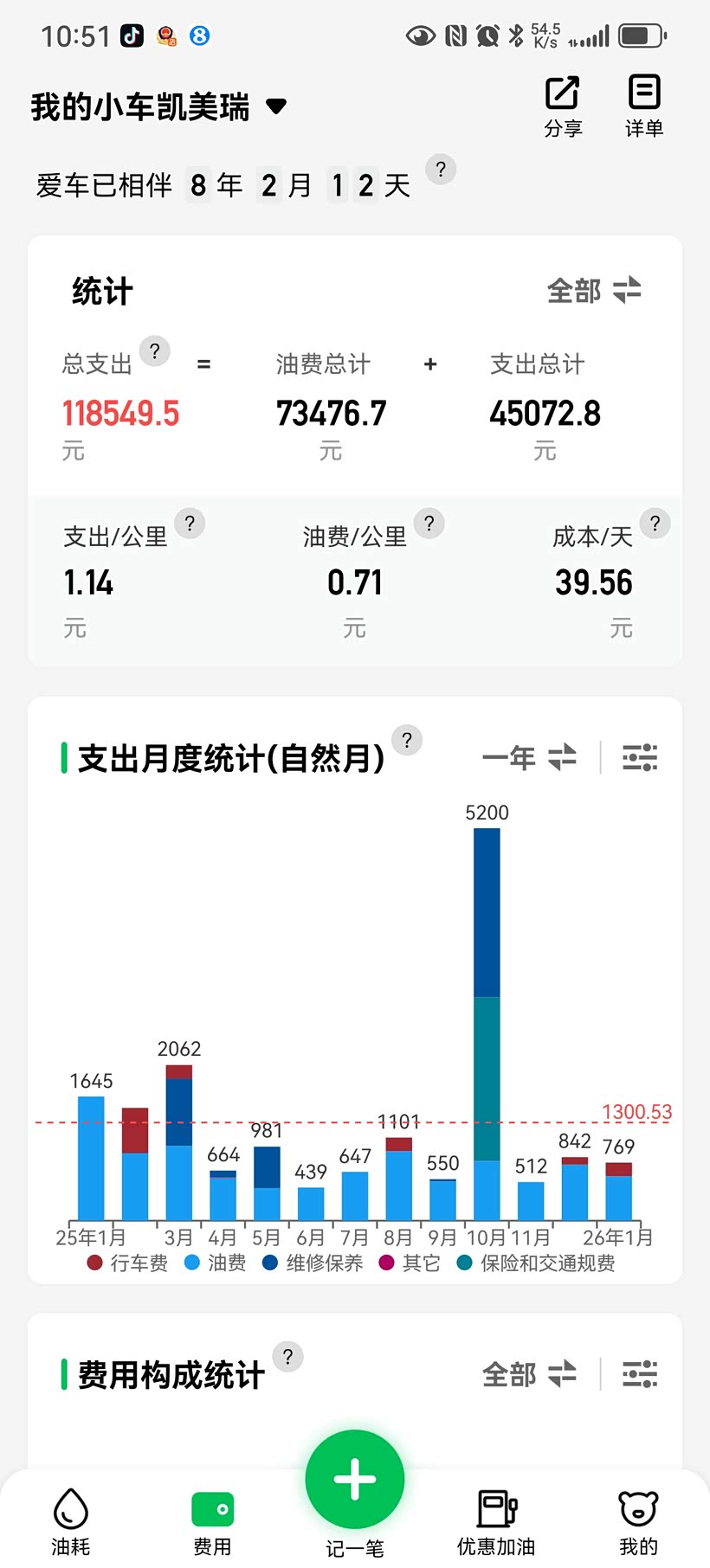 算下来全年油费总计5300元,平均每公里油费仅0.25元。作为一台中型车,能有这样的油耗表现实属难得,不管是日常拥堵通勤还是长途高速自驾,都不用为油费焦虑,既满足了家庭出行的舒适需求,又兼顾了用车成本的经济性,这波选择太值了!