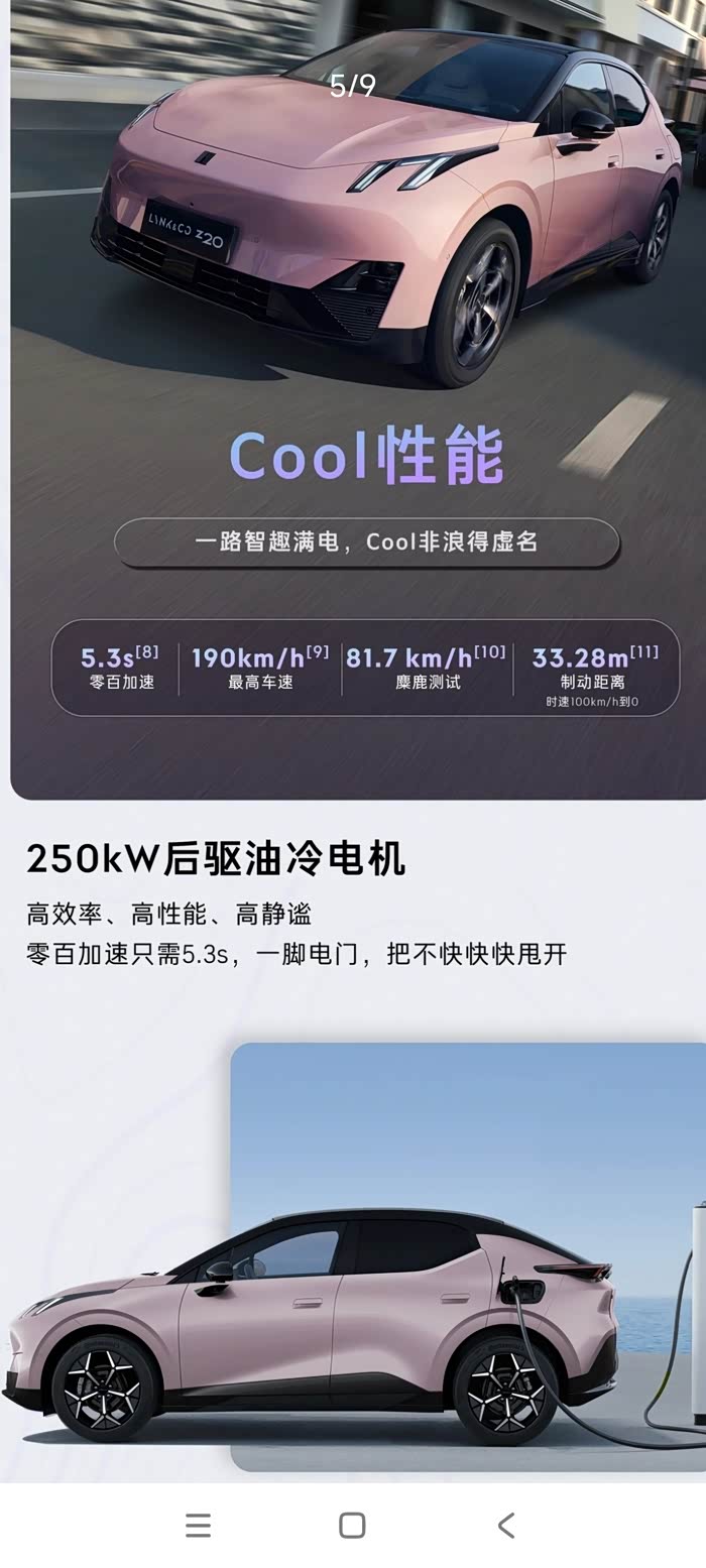 选择理由:对比了不少车:一开始是吉利银河E5横空出世,感觉就是王炸,把比亚迪元plus打的找不着北,同价位各方面都是完胜;后来深蓝S05也越级强杀;宝骏云海带着大疆智驾也颇有诚意;还有启辰VX6大平层带着大床房吸引众多旅行者的心;考拉S大空间还有推拉门也很有逼格;小鹏M03有620公里续航大掀背也是诚意满满,只是轿车没那么喜欢毕竟去乡下没那么方便;星愿上市又是一车难求,性价比着实无敌,可惜提车遥遥无期;哪吒X新款性价比无敌,可惜哪吒汽车风雨飘摇。这半年看的车不少,性价比很高的等车太久,因为要赶省补,必须是现车,而正好领克Z20是12月22号上市,我24号才了解到这车,没想到销售说有别人转的订单,可以提现车,能赶上领省补,我本来都不寄希望今年能买到车了,这叫突然来的幸福还是坑呢?坐等以后验证。