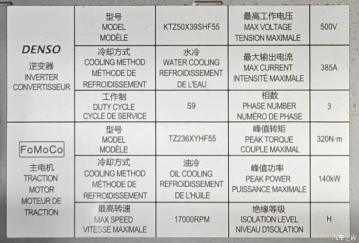 林肯航海家混动系统电控和驱动电机参数标牌