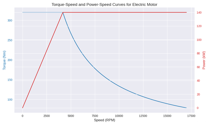 2. 转速在到达4178rpm之前,驱动电机扭矩可以一直维持最大扭矩320N·m;之后扭矩变成倒数函数递减曲线,到达最高转速17000rpm时,扭矩就只有79N·m了。