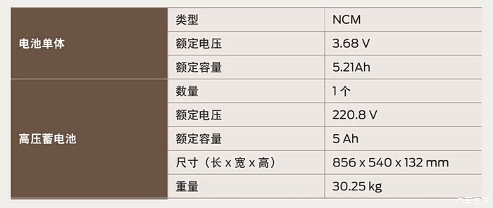 混动系统中的能量来源有两个,一个是汽油燃烧后由内燃机输出的功率、一个是储存在蓄电池中的化学能。根据此前的数据,207kW+动力电池输出功率=227kW,由此可以得出动力电池的输出功率为20kW。