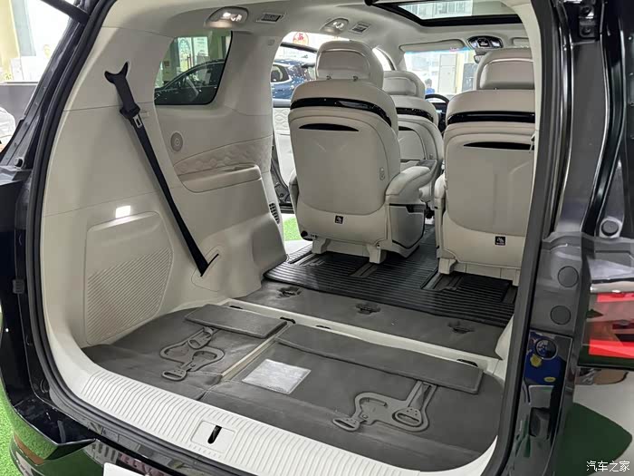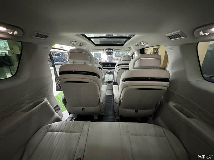 这台车最大的特色就是空间大,起码表面看起来是这样,前后三排空间都非常宽敞,座椅也非常宽大,二排的座椅还是航空椅,带有腿托,可以前后左右四向调节,还有按摩功能,简直就是一个移动的智能会客厅。