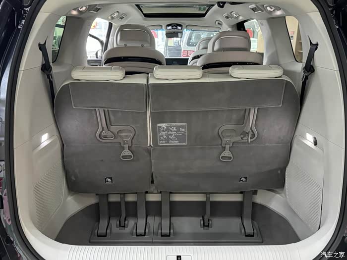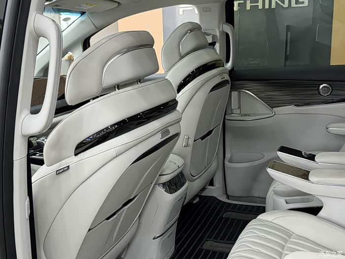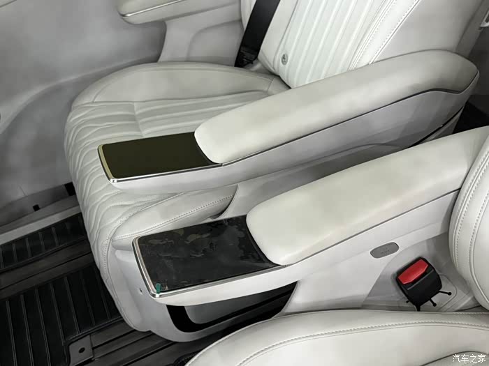 二排的座椅细节,前方都有小桌板,尺寸也挺大,放个电脑或者别的,绝对是够用的,扶手上也有两块触控屏,可以根据个人所需调节座椅的靠背角度、通风加热等,这个想法很不错。啥是豪华?无非就是私人订制嘛!这台车最让人惊喜的就是后排座椅放倒的方式,跟传统的向前放倒不一样,它是向后折叠式收拢,看照片!