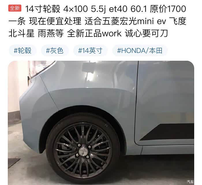 1. 先说说原车的轮毂数据,原车的是12寸 PCD4X100 ET40 4.5B 中心孔56.6,换轮毂的话13寸最好,兼顾舒适和漂亮,14寸轮毂更大,更好看,但是胎壁变薄了,舒适度不如13寸的更不如原车的,15寸的就要切内衬了,而且找不到合适的轮胎,都会超过原车轮胎大小的3%,里程会受影响,所以就不考虑了。