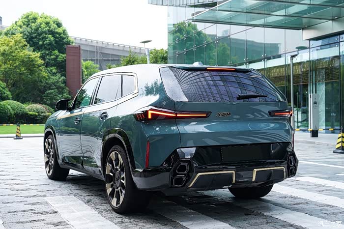 车尾视角,它的尾部采用了很多折角设计,看上去凹凸有致,运用很多的线条进行勾勒,层次感比较丰富,3D立体悬浮M尾灯和中心偏左的XM徽标展现出XM别具一格的设计元素,那回头率和辨识度自然就不用说了吧。