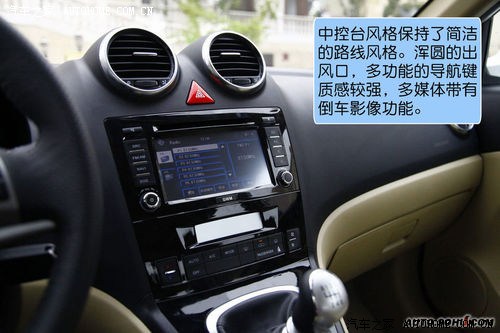 整个内饰使用黑色、米色搭配,说不上有什么风格,只能算是中规中矩,保守简约并不减分。中控台风格保持了简洁的路线风格,触摸式多媒体带有倒车影像功能,屏幕的分辨率还是很高的,清晰的车位线保证了倒车入位的准确率。