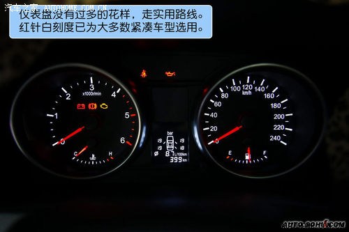 仪表盘没有过多的花样,红针白刻度已为大多数紧凑车型选用。仪表盘中的四轮胎压监控非常实用,具体的数值都会体现在眼前,不过在试驾过程中笔者发现,气压的高低变化在检测中很是明显,过于激烈的驾驶会让轮胎温度上升,导致胎压报警异常灵敏。这是在试驾其它车型的时候没有感受到的。虽然不是大问题,但多少对驾驶有些影响精神。