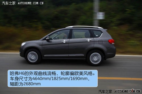 H6的车身侧面用两条筋线从车头延伸到车尾,凸显肌肉质感,而其余部分都很平滑。190mm的离地间隙很普通,没有越野车的优势。哈弗H6使用了一套佳通专门为城市SUV设计的轮胎,尺寸为225/65 R17,这个尺寸的轮胎配合了一套双五幅轮毂,美观且大气。