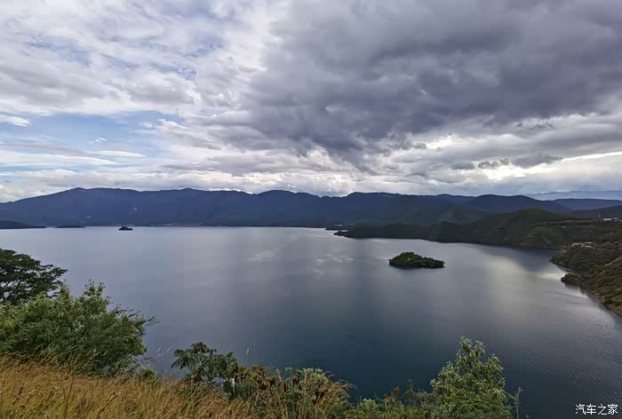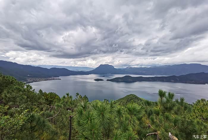 下午2点半,到了泸沽湖景区云南入口。购票进入后,将车子停在停车场,可以到观景台看泸沽湖。观景台位置不错,可以看泸沽湖全景。下面这张照片即是在观景台拍的,可惜天气不好,乌云遮盖,看不见蓝天,云也不是白的。有点可惜,如果我们在这里多呆20分钟,就有蓝天白云了。