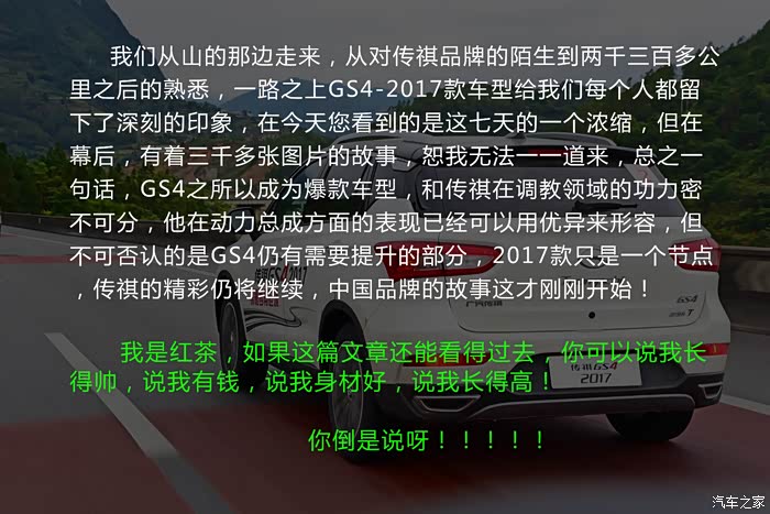 2016年11月21日,受汽车之家委托,我再一次踏上征程,跟随传祺车队一路从广州驾驶广汽传祺GS4的两种车型前往云南西双版纳,在这一路我们会横跨三省,从中国经济的最强音行驶到边陲小镇,从中国跨越到越南,从一带一路的广州到茶马古道的那柯里,经历了平原的一马平川,也有过云南山区高速和乡间小路的崎岖,2017款传祺GS4两种变速箱匹配究竟有什么不一样,在这样的道路上行驶带来的驾乘感受是什么?红茶将在这七天游记中带给你最真实的感受,我们不去谈参数不去谈配置,只说你想了解的,欢迎大家在文章中回复提问,我会尽量解答。