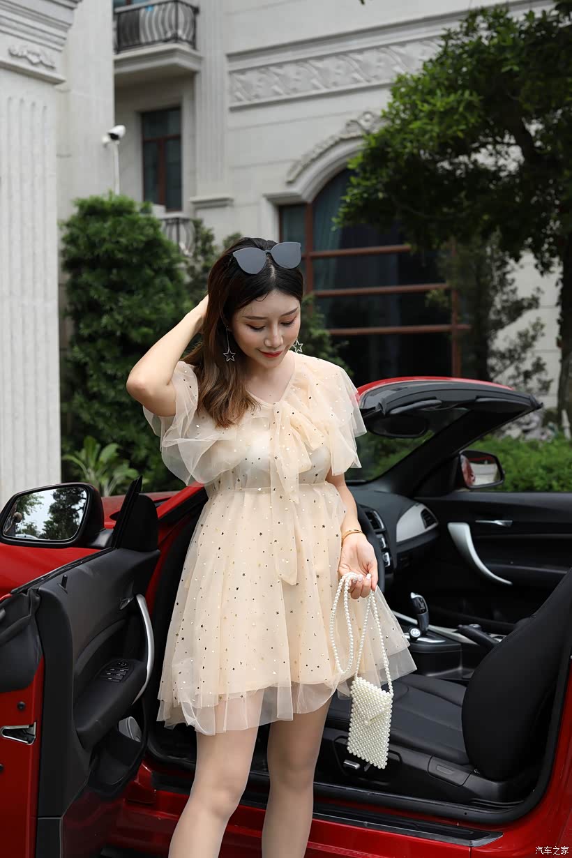 到达拍摄地点的时候,因为是提前约好的姑娘已经在那里等着了。那辆红色宝马敞篷车,看着就很有活力,车身线条流畅又利落,红色漆面在阳光下亮得晃眼,像一团跳动的火焰。它的敞篷设计特别有特点,打开之后,整个车顶都收了起来,视野一下子变得开阔,让人忍不住想坐进去溜达一圈。
