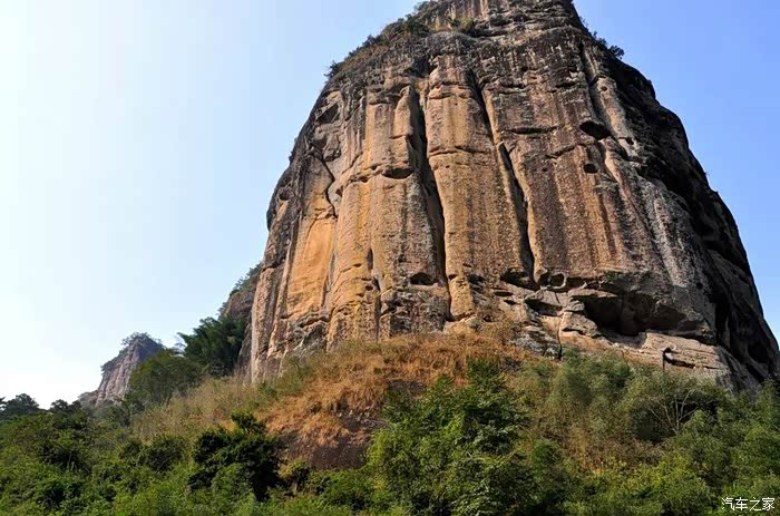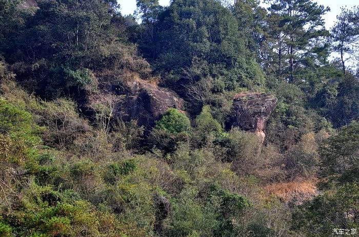 过小九曲,经题诗岩,溪边这壁立万仞的山峰为大藏峰,大藏峰半壁有一上一下的两个洞穴,下为金鸡洞。