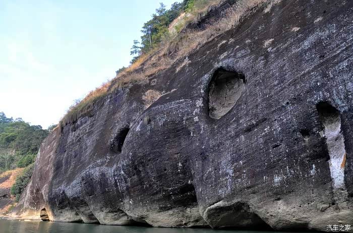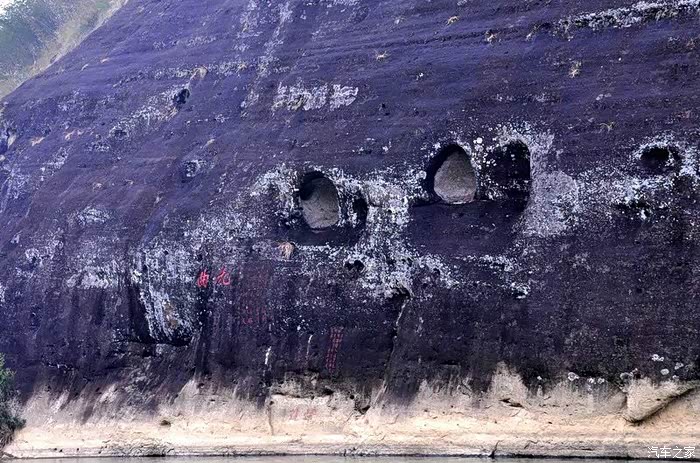 这耸立溪畔的危岩峭壁是小藏峰,仰望崖际可见三千多年前古越人的悬棺葬具“船棺”,临空悬架的船棺早已被盗墓者捣坏,只剩下一些木片残骸在里面。