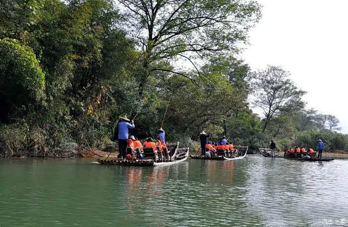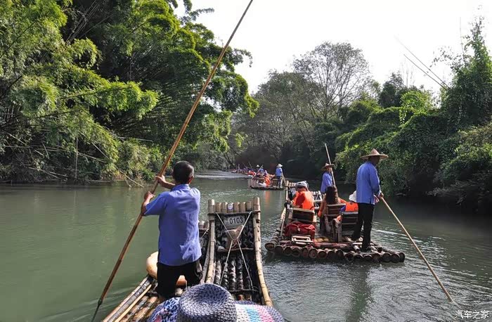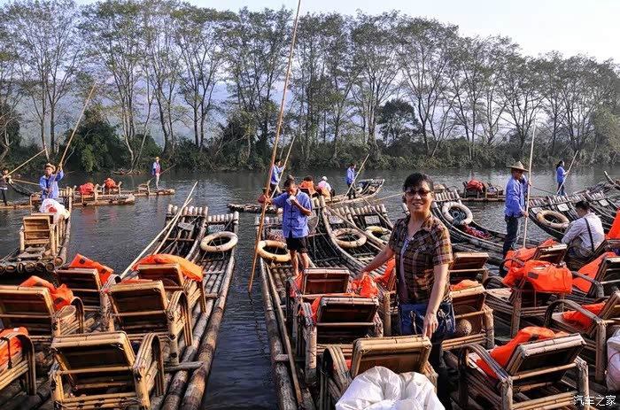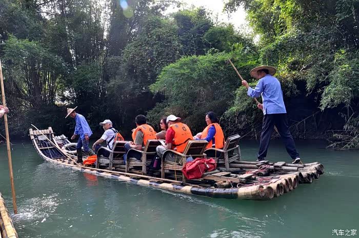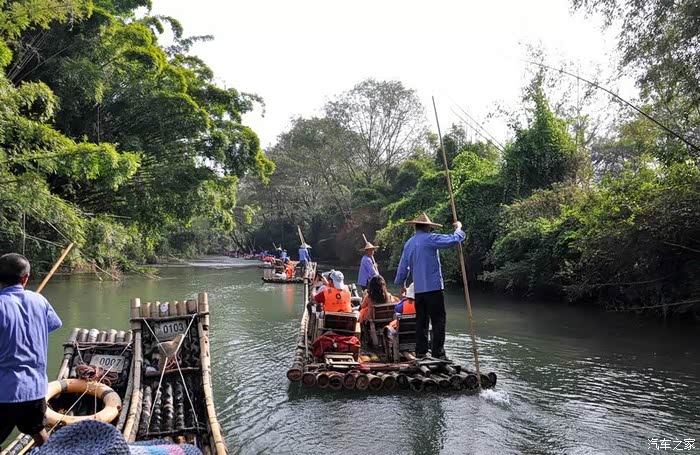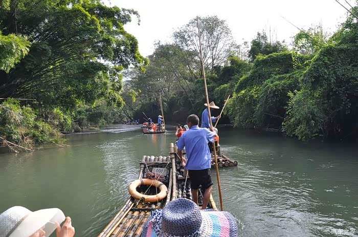漂流是一只竹筏6个人,当地有个不好的风俗,就是要给艄公小费,虽说给不给小费自愿,但是如果你不给的话,这一路艄公只会撑船,不会向你介绍景色,你要求停下来拍照他们也会以不准停船为由而拒绝,你看了也等于白看。如果给了,艄公会慢慢划动,沿途讲解风景风情,否则就会把竹筏划得飞快,本来一个半钟头的水路,他40分钟就可以把你漂流完。入乡随俗,小费以前也不多每人10元,不过现在涨了,每人最少20元,何苦让艄公不高兴呢,所以,我们6人商量了一下,每人给30元,一登竹筏,就给了小费。