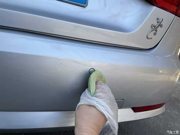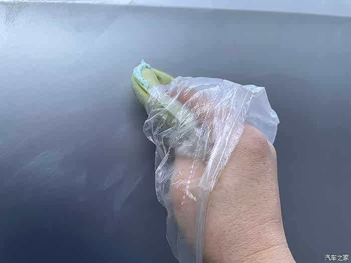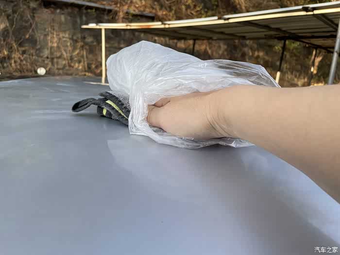接着对车尾进行涂蜡施工,为了避免蜡沾到手上,我还是套了一个塑料袋。