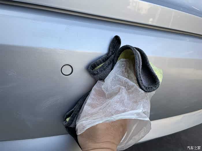 右侧车身涂完后,车尾的蜡干的差不多了,用干毛巾对漆面进行抛光。