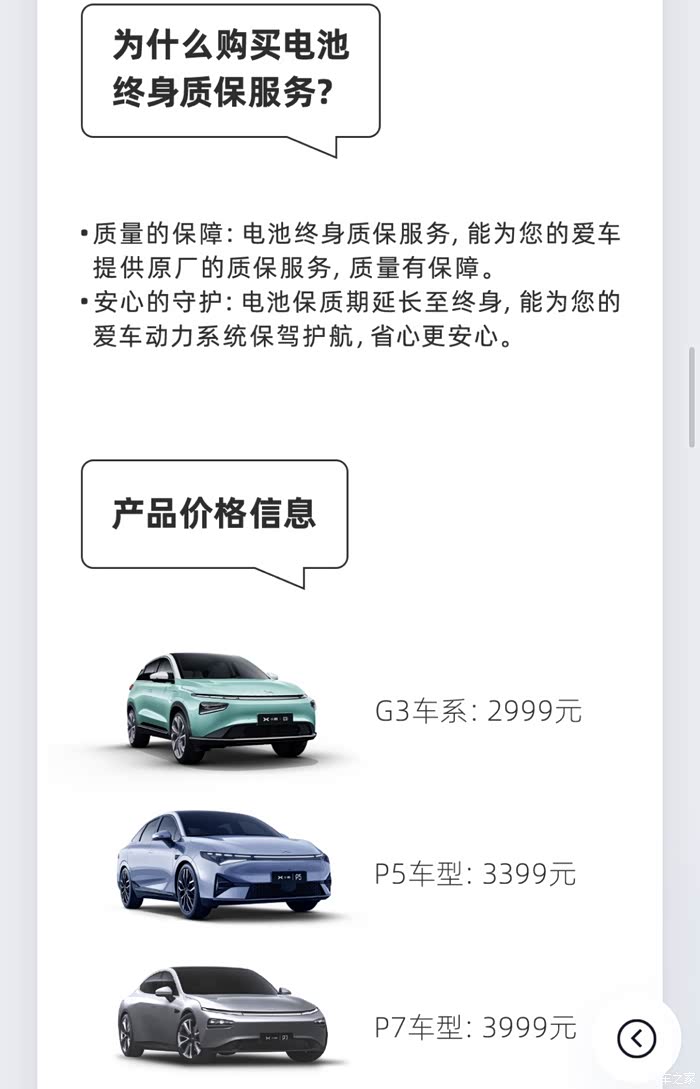 再说说很多新鹏友比较在意的电池终生质保,我的建议是,如果你每年跑的公里数很多,而且车辆计划使用8年以上,那可以买一个,否则就没有必要。因为小鹏官方对于动力电池的质保是8年或15W公里(以先到者为准),以我自己来举例,我每年跑不到2W公里,而且估计这车大概率用不到8年就会换车,所以我就没有购买这个服务。