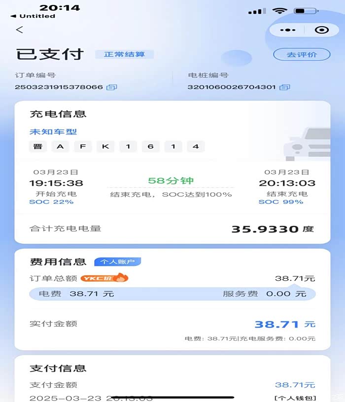 最终经过1个多小时,电量终于充满了。根据显示,从22%开始,到充满,一共充了35.933度的电量。对于这个数字,个人觉得是满意的。也说明,我的蓝山没有出现电池衰减。