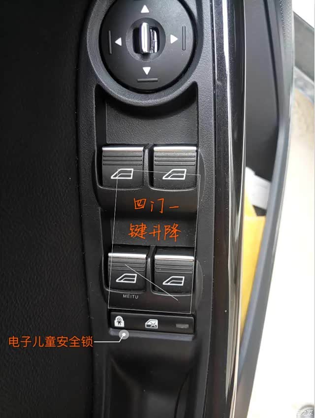 如图哈,带小人标志的就是电子式的儿童安全锁,这个功能对于有小孩的家庭比较实用。四门一键升降说实话,对于车子那么多豪华配置来说并不起眼,但是就是有一些不厚道的车子不配备。然而这是非常方便车内所有人使用的实用功能。