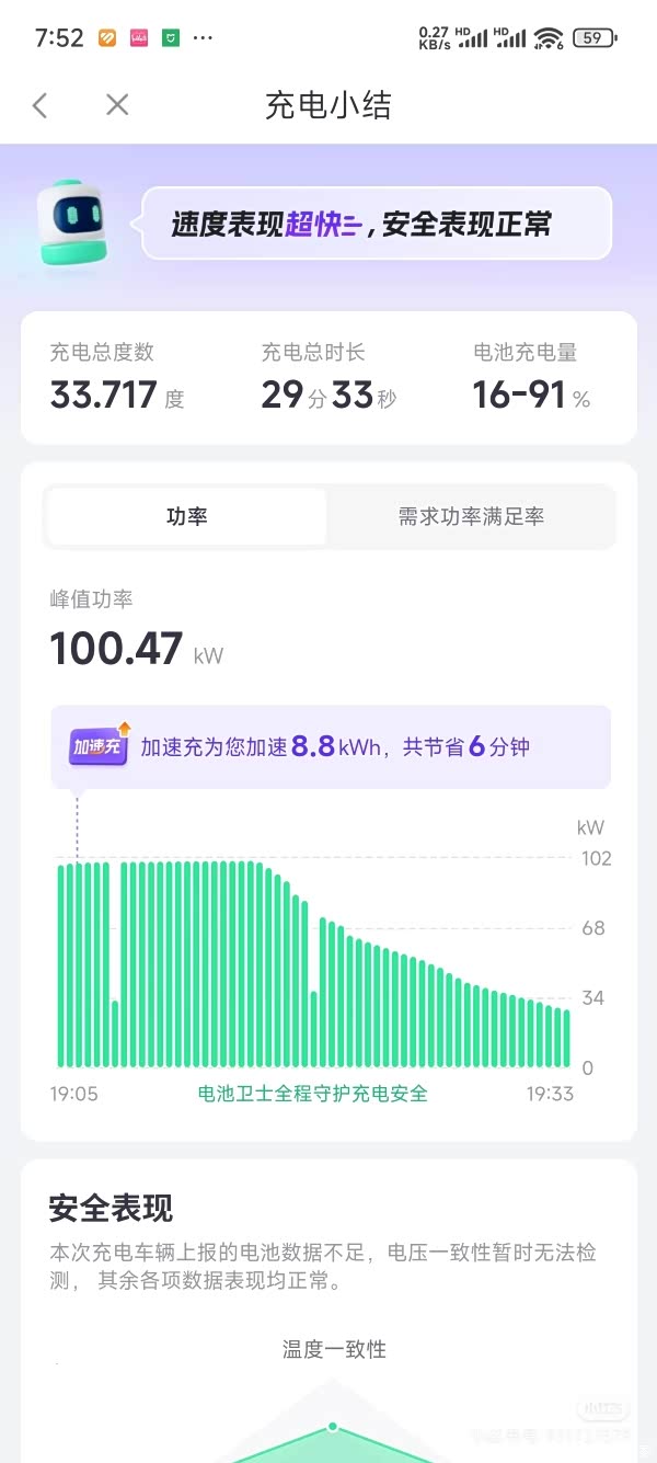 离家一公里的超充站,早上七点多去充电,差不多是半个小时充入34度电,峰值功率一百千瓦的样子,差不多从百分之八十开始降低功率,到百分之九十以上后衰减到30千瓦以下,最后百分之几充电速度会很慢,磷酸铁锂的充电指南是尽量充满校准电量,但是超充桩几乎都是最高充到98 99的样子就断电了,这一点长期来看可能会导致电量不准,增大失速的风险,建议别搞太极限,提前开增程器以防万一。