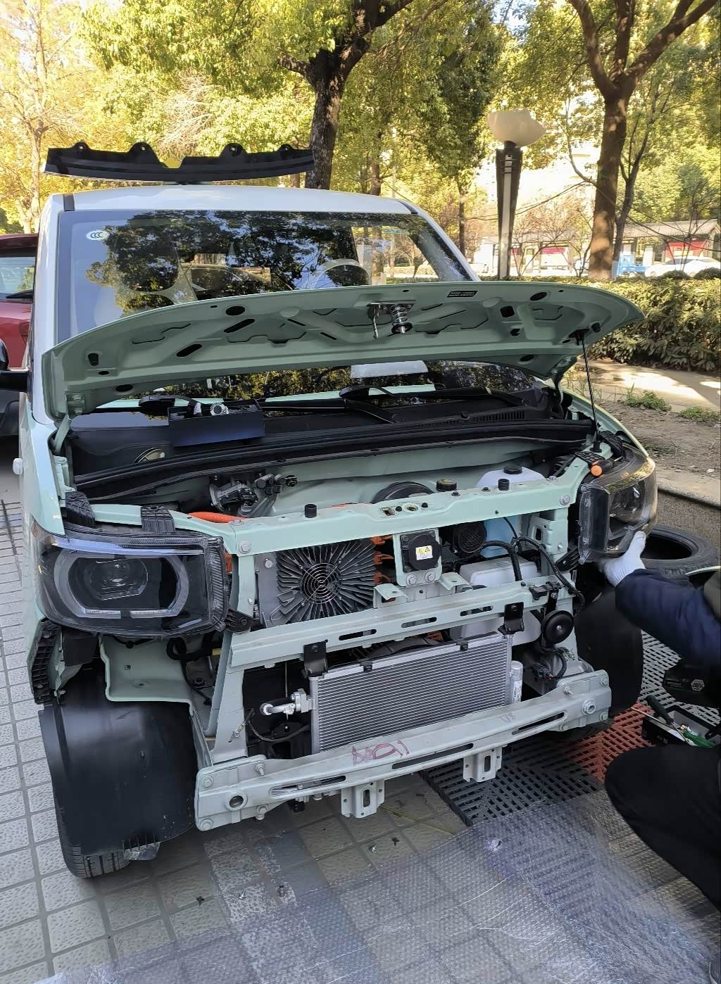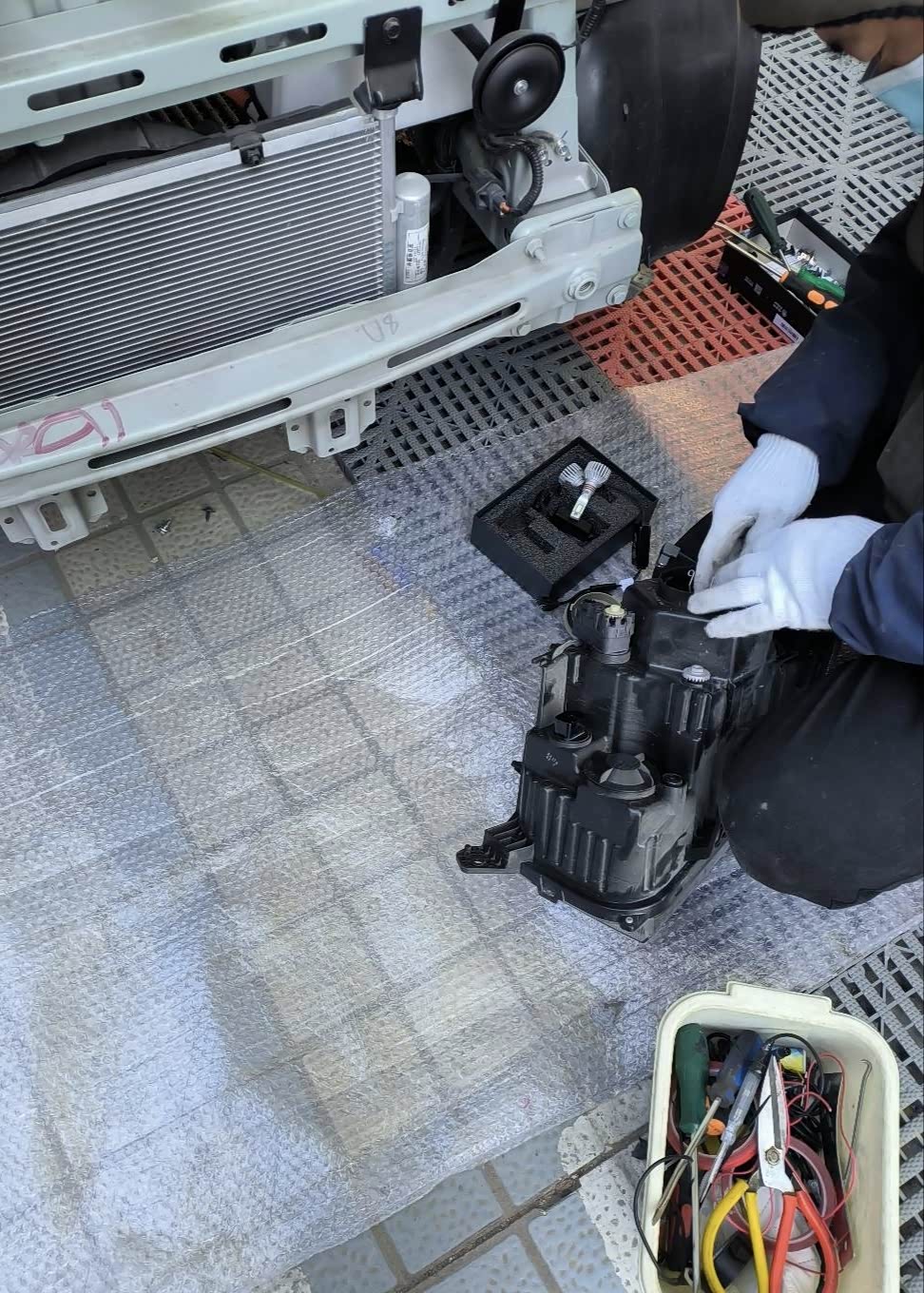 开到汽修店,发现由于mini前机舱太小,换灯泡竟然要拆杠!我瞬间心疼起来,犹豫是否拆杠还花了不少时间做心里建设,实在不太愿意新买的车就拆成这样,但是为了更换更亮的灯泡,我还是同意了拆杠,以及拆下大灯总成