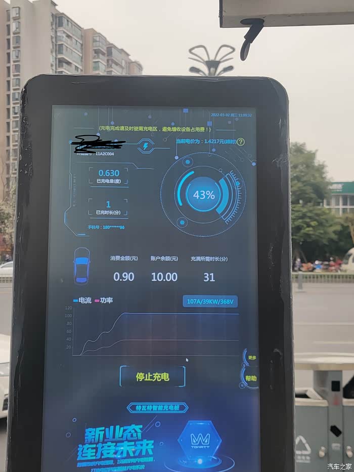充电桩的大屏幕会实时显示充电时长,已充电量,电流,功率等信息。另外还有一个预估大概充满整辆车的时间。像我的小新现在还有40%左右的电,如果要充满的话需要充半小时。真的还是很快的了。