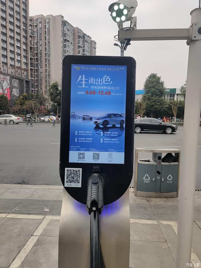 还挺难得看到这么一整长排的室外充电桩,看着还挺震撼的。运气很好正好就在进门口就有一个车位空闲,不需要再开车进去找车位了。