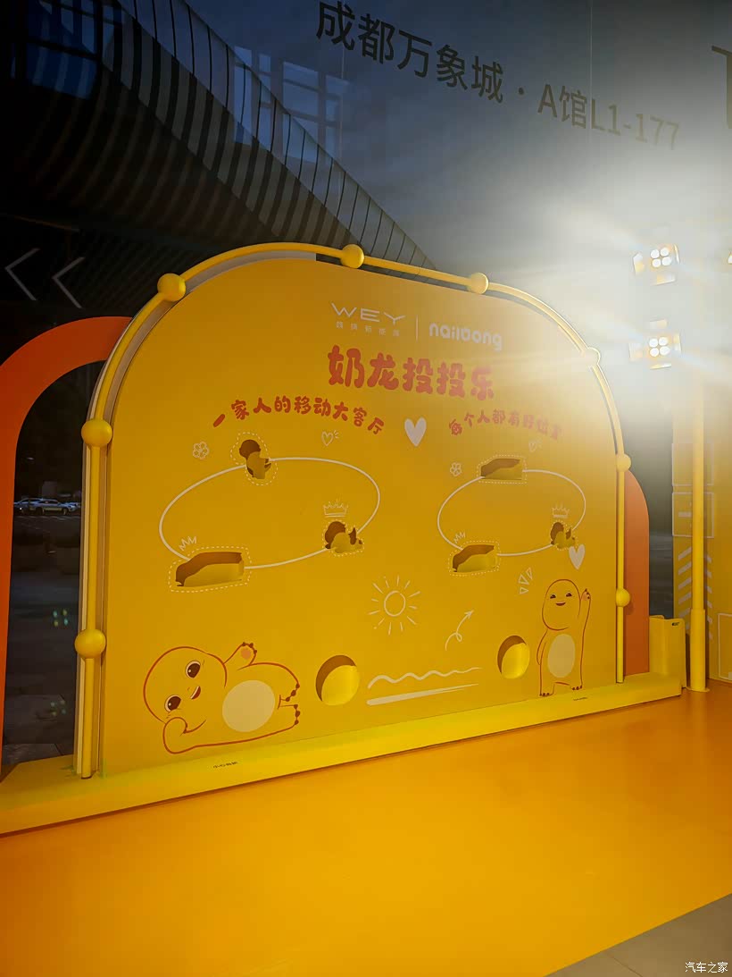 现场准备了多项有奖打卡活动,投球、卡牌翻转以及寻找奶龙的活动,活动完成后会有小礼品赠送,现场有很多家长带着孩子驻足体验。一个小女孩指着车身的奶龙贴纸咯咯笑。