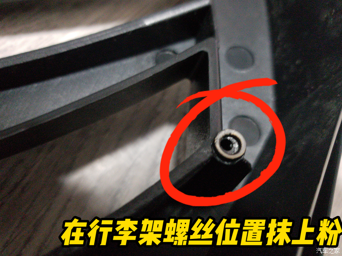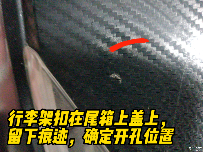 方法很简单,我在行李架螺丝位置抹上粉,偷了老婆一点抹脸的东西,我 也不知道叫粉底还是啥的,反正能用。往尾箱上盖安装位置一扣,就留下印记了。开孔位置就确定了。