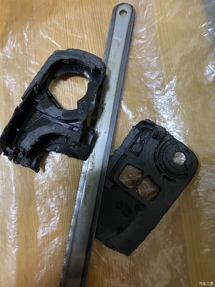 看了教程,什么火燎松动粘缝胶,螺丝刀撬开统统都不好使,先把机械钥匙一侧的塑料弄断,把机械钥匙装置全部取下,然后上神器,用小锯条开锯,注意要观察电路板在夹层中的位置,把壳锯开