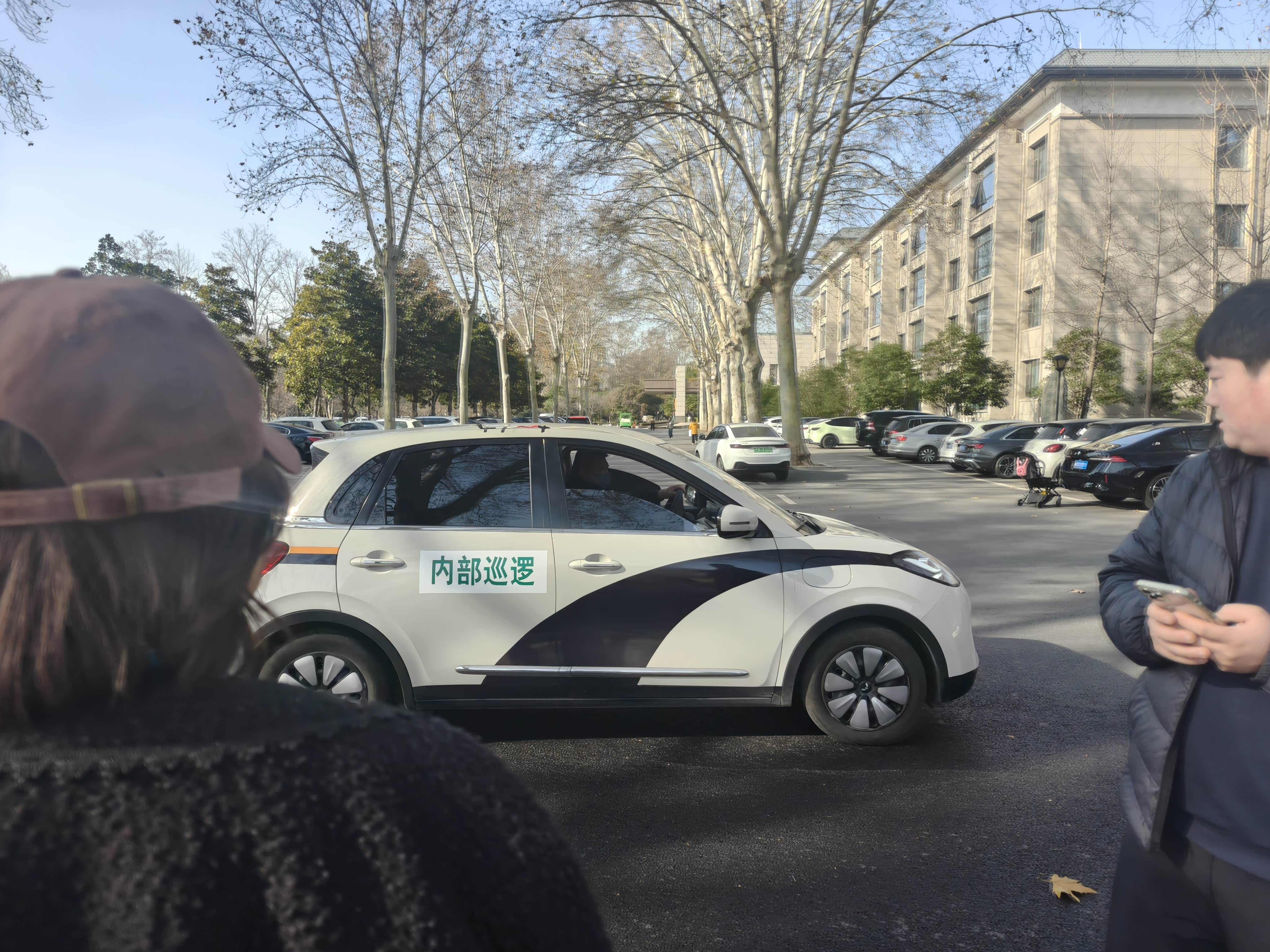 我们的缤果与巡逻车并排停放,两个孩子好奇地比较两车配置,车主正与保安交流用车体验。
